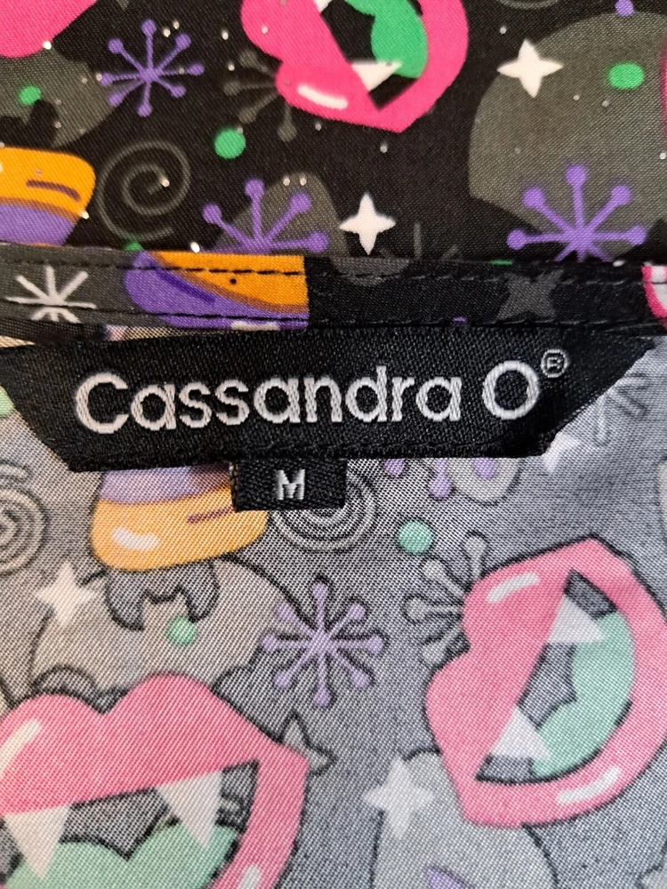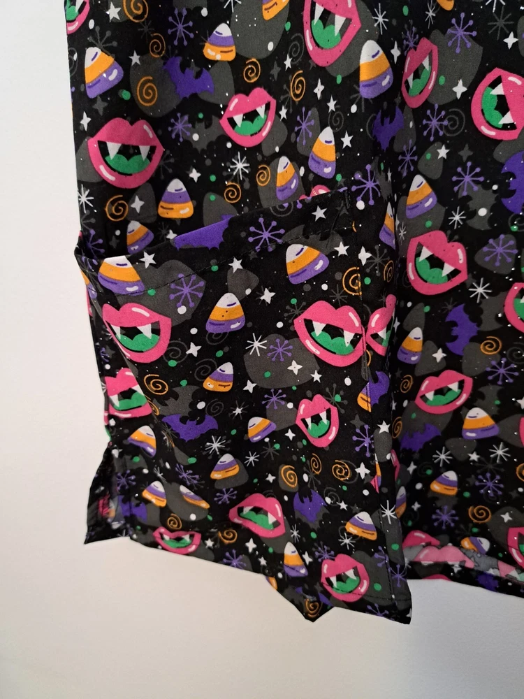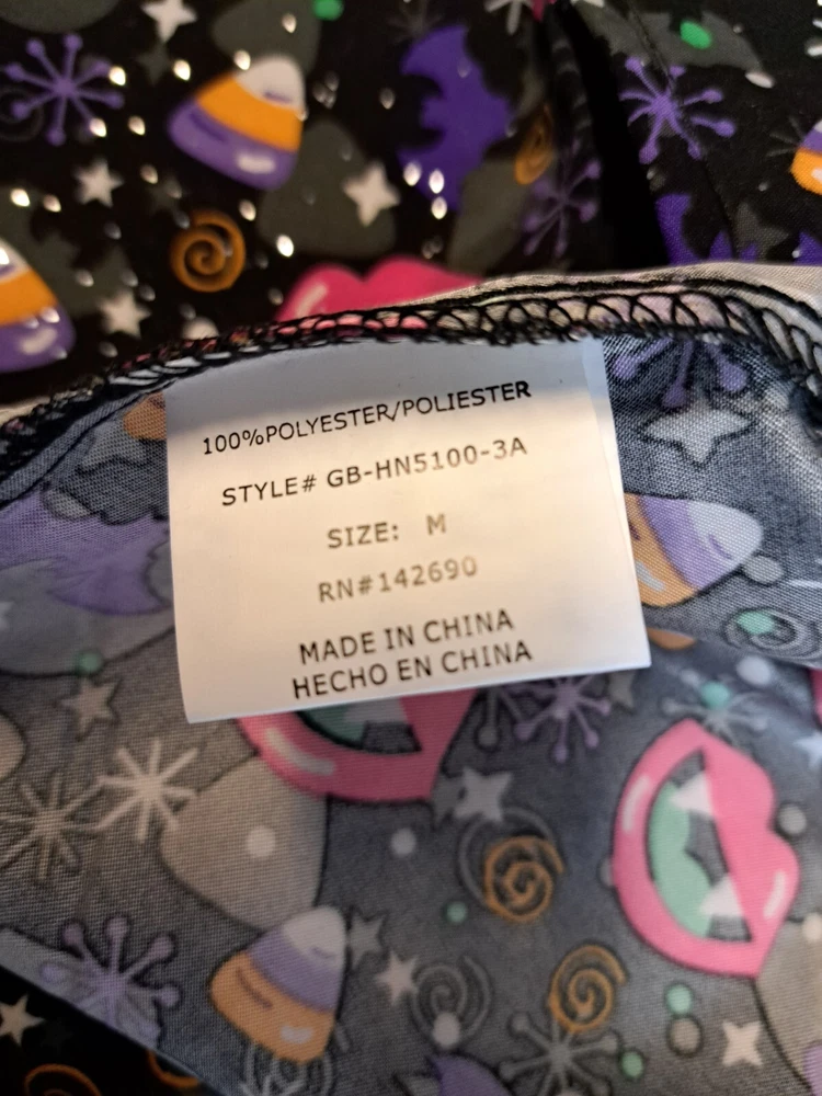 Fabric is 100% polyester. Chest (armpit to armpit): 22 inches. Length (collar to hem): 27 inches. 2 pockets. RN#142690