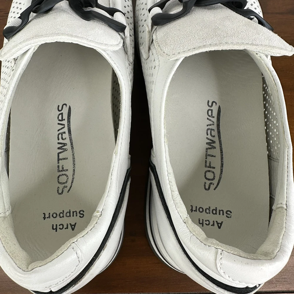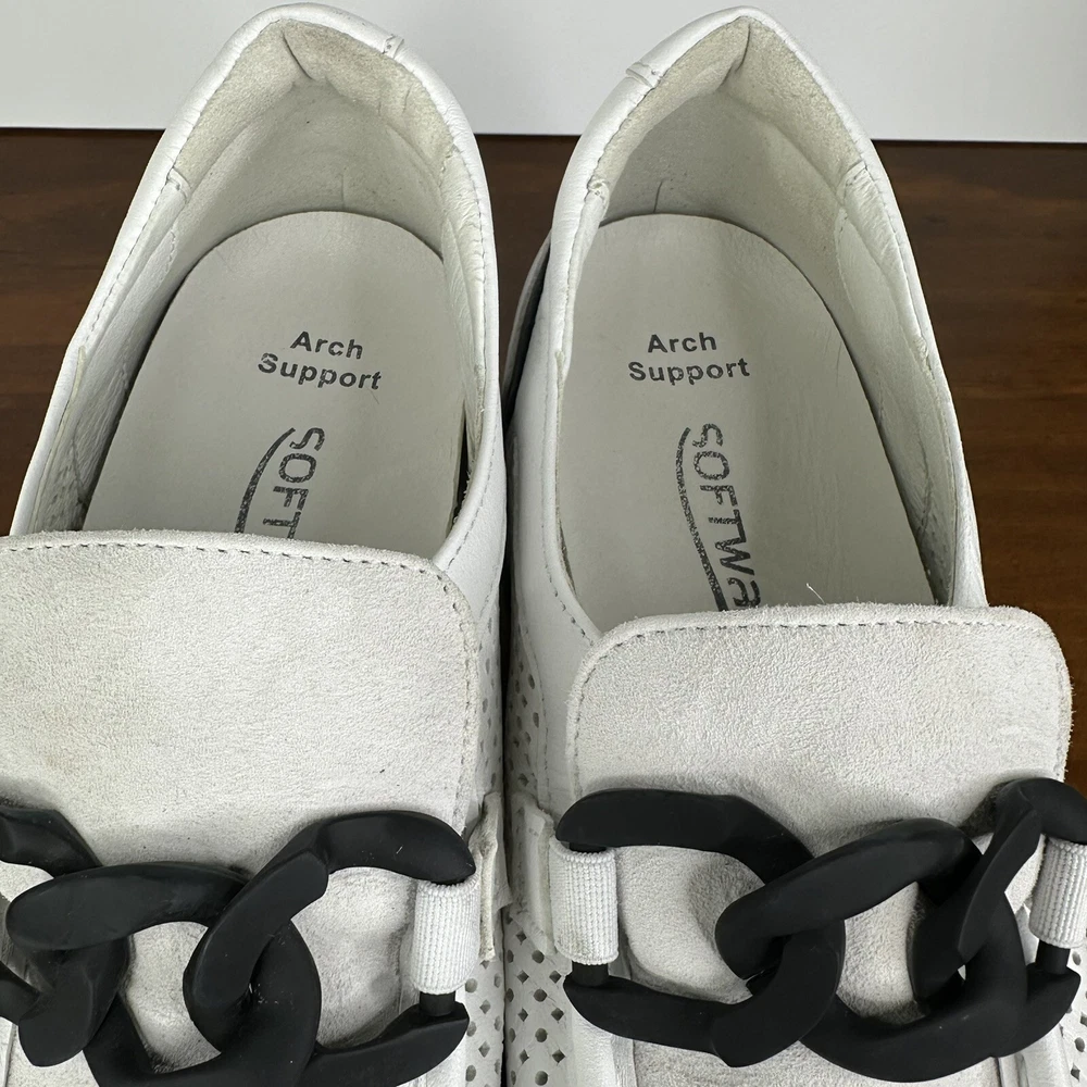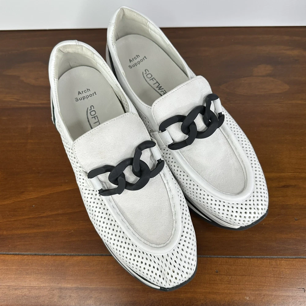 Accents: Chain Strap Theme: Athleisure, Softwaves, Casual, Comfort Heel Height: Low (1-1.9 in) Color: White Outsole Material: Rubber Features: Arch Support, Cushioned, Memory Foam, Padded Seller Notes: “In great condition - very little wear.” Shoe Shaft Style: Low Top Brand: Softwaves Department: Women Pattern: Solid Lining Material: Leather Vintage: No Type: Casual List Date: 120924 Model: Softwaves Cassie Product Line: Softwaves Occasion: Activewear, Casual, Travel EU Shoe Size: 38.5 Toe Shape: Almond Toe Upper Material: Leather/Suede Heel Style: Platform Season: Fall, Spring, Summer Performance/Activity: Walking, Athleisure Style: Slip-On Insole Material: Foam US Shoe Size: 7.5 Closure: Slip On