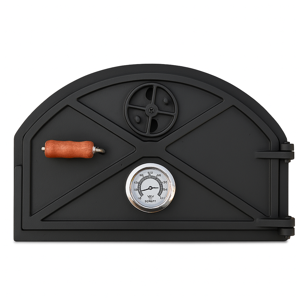 ✅ Description Upgrade your outdoor cooking experience with this cast iron oven door , specially designed for wood-fired ovens. Featuring a built-in thermometer and left-side wooden handle , it combines durability with functionality for perfect cooking results. Ideal for BBQ enthusiasts and outdoor kitchens, this door is crafted to withstand high heat and last for years. Specifications: Brand: Sor Pampa Grill Material: Cast Iron Color: Black Dimensions: 5.1" D x 23.4" W x 14.96" H Features: Thermometer, Vent, Left Handle ✅ Bullet Points (Highlights) Heavy-duty cast iron oven door with built-in thermometer Perfect for wood-fired cooking , retains heat for better baking Convenient left handle for easy access and control Durable, heat-resistant construction for long-term use Size: 23.4" W x 14.96" H x 5.1" D