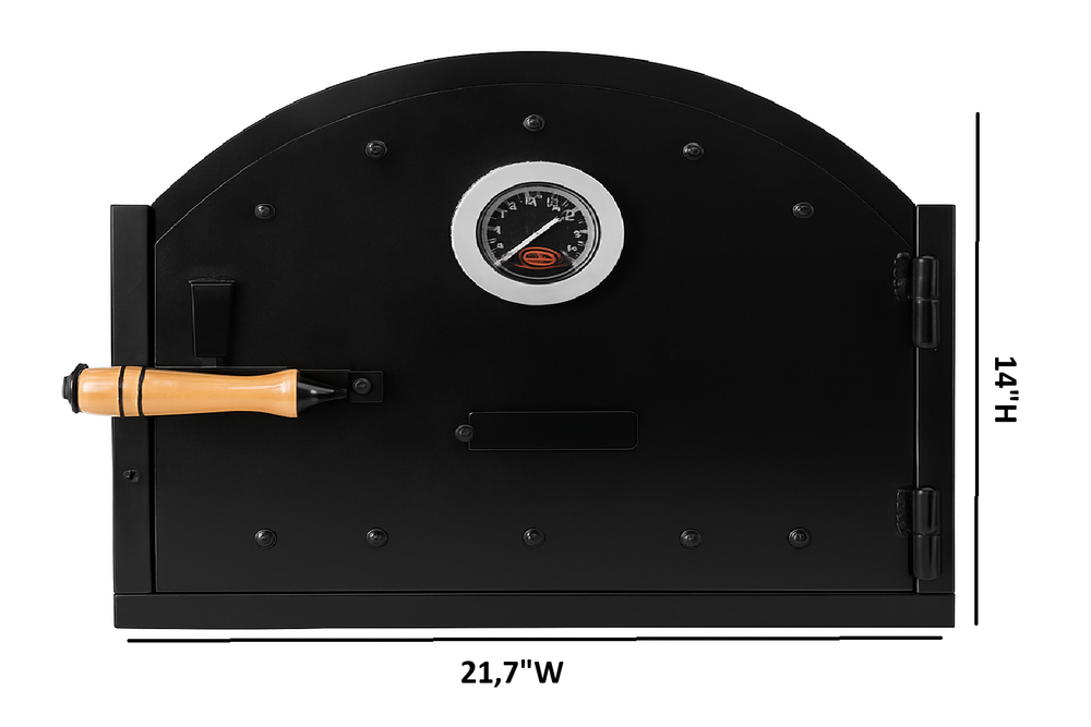 ✅ Description Upgrade your wood-fired pizza oven with this heavy-duty cast iron oven door featuring a built-in thermometer and ergonomic wooden handle . Perfect for maintaining heat and achieving authentic pizza flavors. Durable and stylish, this door ensures even heat retention and cooking precision for your oven. ✅ Key Features ✔ High-Quality Cast Iron – Exceptional durability and heat retention ✔ Integrated Thermometer – Monitor temperature for perfect cooking ✔ Ergonomic Wooden Handle – Safe and comfortable grip ✔ Large Size – 21,7" W x 14" H, fits most traditional pizza ovens ✔ Rustic Black Finish – Complements any outdoor cooking setup ✅ Dimensions & Specs Width: 21,7" (Inches) Height: 14" (Inches) Depth: 3" (Inches) Weight: 31 lbs Material: Cast Iron Color: Black