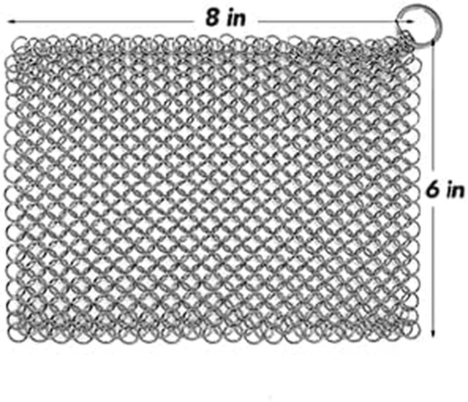 MATERIAL: The cast iron skillet cleaner applies premium grade never rusting stainless steel. It is built with soldered and handmade, which makes it durable and stronger. Boasting unmatched durability and please be assured to use. MULTIFUNCTIONAL: This chainmail multi-purpose scrubber can be ideally used for cast iron pans, skillets, glassware, pizza stones, plates, baking sheets, teapots, cookie sheets, cauldrons, camp chef griddles, tortilla press, waffle makers, pie pans, dutch ovens, griddles, woks, and casserole dishes. EASY TO USE: The Cast Iron Cleaner helps you to effortlessly clean all your cookware pans without stripping away accumulated flavor and seasoning or scratching your pans. Just add some warm water and scrub any residue which is easy and quickly and easily. DISHWASHER SAFE AND EASY TO STORE: Ultra-hygienic and dishwasher safe. To clean, just throw it in the dishwasher. You could just hang it somewhere in your kitchen with that hanging ring on it, no worries about losing it. LIFETIME SATISFACTION GUARANTEE: If you are not satisfied with our products, you may contact us for a refund or a new replacement. Our Excellent customer service will leave you with no worries after you buy it. Product Description Have you ever thought of a pot cleaner that is hygienic and very durable or uses it for lasting a long time? So, you can purchase our product. Our stainless steel Cast Iron cleaner is a good choice for you! Stainless Steel Cast Iron Skillet Cleaner Chainmail Cleaning Scrubber With Hanging Ring for Cast Iron Pan, Pre-Seasoned Pan, Griddle Pans, BBQ Grills and More, Pot Cookware Quality You Can Trust! Our cast iron skillet cleaner applies premium grade never rusting stainless steel. It is built with soldered and handmade, which makes it durable and stronger. Soft enough to prevent scratches, but tough enough to tear through grit. Clean Cookware Easier! The magic of our cast iron cleaner work wonders and make cleaning a breeze through. Scrub any residue with warm water which will release quickly and easily. No soap or harsh detergents needed. Perfect for cast iron restoration as well. Easy To Store And Clean! You could just hang it somewhere in your kitchen with that hanging ring on it, it’s never going to get lost under the kitchen, no worries about losing it. Ultra-hygienic and dishwasher are safe. To clean, just throw it in the dishwasher. Unlike steel wool, we made our chainmail scrubber with 316L stainless steel. 316L is a very special material with low carbon, but durable, corrosion-resistant and heat resistant. And it is popularly used on marine profects. 316L is soft and smooth enough to prevent scratches; meanwhile, it could easily remove residue from the pans and pots. it is built for long lasting use. Multi-functional and could be used to all kinds of cookware. Our chainmail multi-purpose scrubber can be ideally used for cast iron pans, skillets, glassware, pizza stones, plates, baking sheets, teapots, cookie sheets, cauldrons, camp chef griddles, tortilla press, waffle makers, pie pans, dutch ovens, griddles, woks, and casserole dishes. Value Size Square:8×6inch