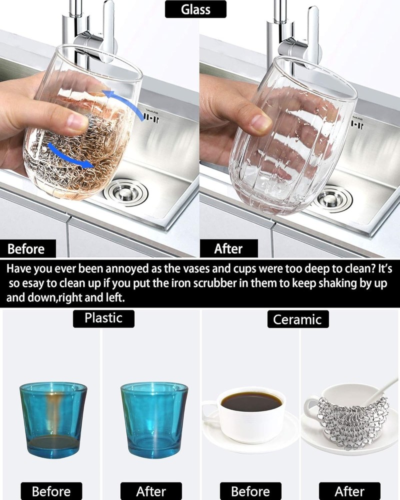 Cast Iron Skillet Cleaner Chainmail,2 Pack 2 Piece Assortment, Silvery Product Details Package Dimensions : 3.82 x 3.43 x 0.98 inches; 1 Pounds Item model number : 2PCSCLEANER Manufacturer : ONEEKK Brand: ONEEKK Color: Silvery Handle Material: Stainless Steel Specific Uses For Product: Cast Iron Pans, Stainless Steel, Glassware, Bakeware Material: Stainless Steel, Chain Maille 【CLEAN QUICKLY AND PERFECTLY】ONEEKK cast iron skillet cleaner is made of Premium 316 stainless steel smooth ring, chain mail link design, lock and scrub stubborn stains efficiently, helping you effortlessly clean cast iron products without stripping cast iron seasoning. Chain maill to clean cast iron any residue with warm water which will release quickly and easily. No soap or harsh detergents needed. A new cast iron back again. 【MULTI-USE SCRUBBER】The cast iron scrubber/Stainless Steel scrubber/cast iron cleaning kit Suitable for all uncoated cookware, likes bakeware, tea pots, cauldrons, wok, pre-seasoned pan, griddle pans, BBQ grills, tortilla press, hibachi, waffle maker, muffin pan, pie pan, Dutch oven and casserole and more! Smaller size cast iron cleaner can clean deep inner wall by its own weight. Lightweight and convenient for home, camp chef or travel. 【HYGIENIC & REUSABLE】Our chain maille scrub mesh is made with restaurant-grade 316 stainless steel that resists rust and fiber deformation shedding, keeps away from odors and mildew for optimal longevity. It's ideal cast iron cleaning kit to instead of cast iron sponge and steel wool scrubber. 【EASY TO USE, CLEAN AND STORE】Circular design enable central& outer rings superior grip. Chainmail ring size enables effective cleaning residue. Ring to hang on a hook after washing. Dishwasher safe.