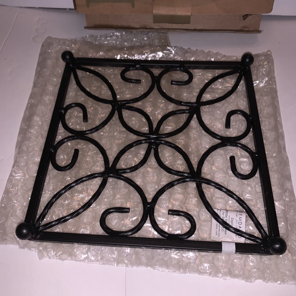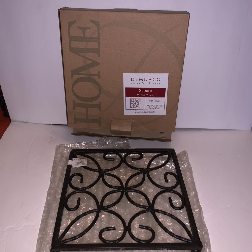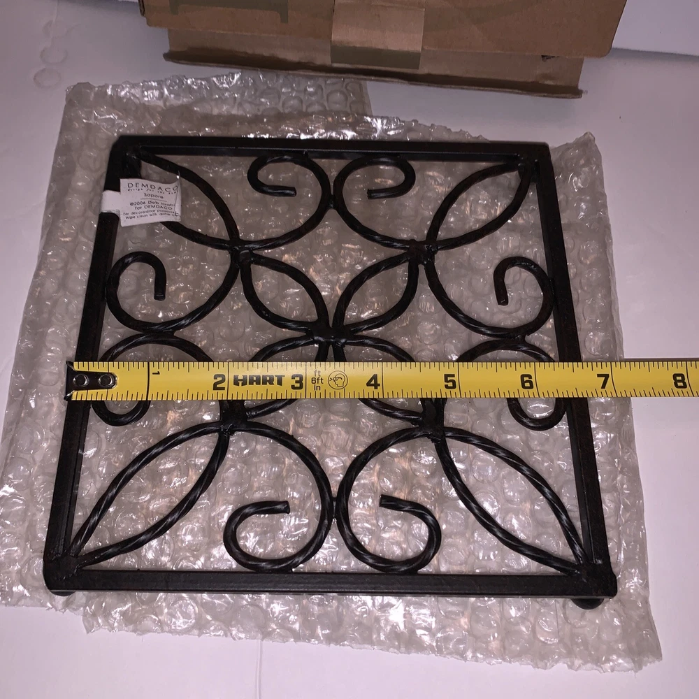Time Period Manufactured:2000-2009Set Includes:1 x TrivetCountry/Region of Manufacture:ChinaShape:SquareModified Item:NoBrand:DemdacoHandmade:NoNumber of Items in Set:1Pattern:Saporegtin13:Does Not ApplyCustom Bundle:NoMaterial:Cast IronFood Compatibility:NoFeatured Refinements:Cast Iron TrivetComponents Included:TrivetOriginal/Reproduction:OriginalMeasurements:6 3/4”UPC:Does Not ApplyType:Pot PadColor:Black