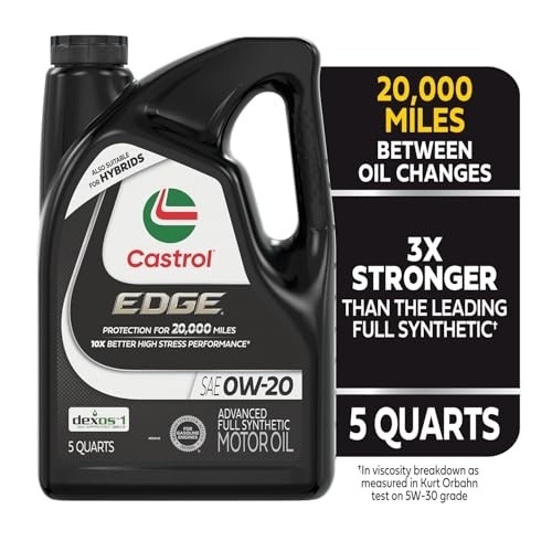 Castrol EDGE 0W-20 Advanced Full Synthetic Motor 5 Quarts, Pack of 3, Amber Product Details 3X Stronger than the leading full synthetic* 10X Better high stress performance** 20,000 miles between oil changes*** *Viscosity breakdown as measured in Kurt Orbahn test on 5W-30 grade **As measured in Seq IX test under high load/torque conditions vs. API SQ test limits ***Or one year, whichever comes first Approved and Licensed Specifications: Exceeds API SQ/SP/SN PLUS/SN || ILSAC GF-7 || GM dexos1 Gen 3 Meets engine test requirements of Chrysler MS 6395 || Meets Ford WSS-M2C947-B1 || Meets Ford WSS-M2C962-A1 Castrol® EDGE® 0W-20 is an advanced full synthetic motor oil and the optimal choice for drivers who want the best combination of wear protection, viscosity control and thermal stability to maximize engine performance. It's formulated to provide Superior Performance and Protection in 7 Critical Areas including fuel economy, high temperature performance, sludge control and wear protection.
