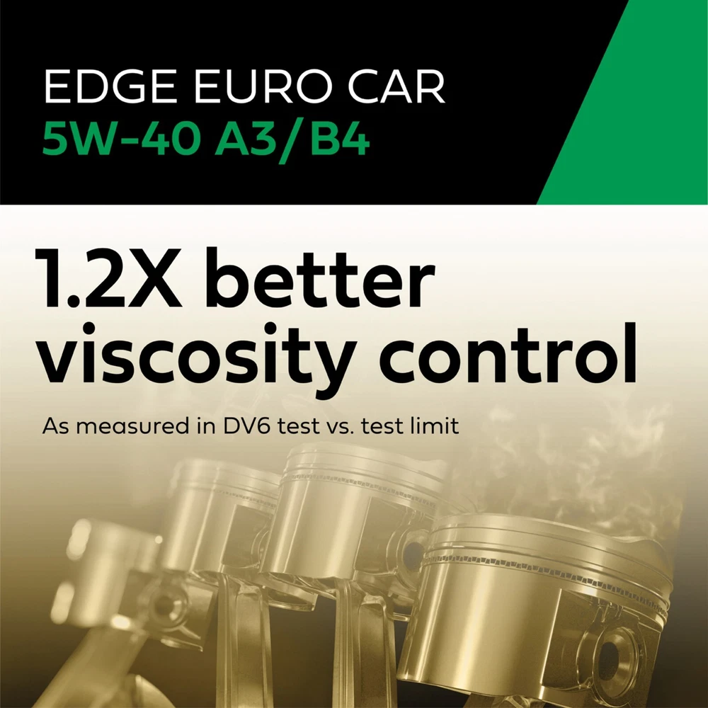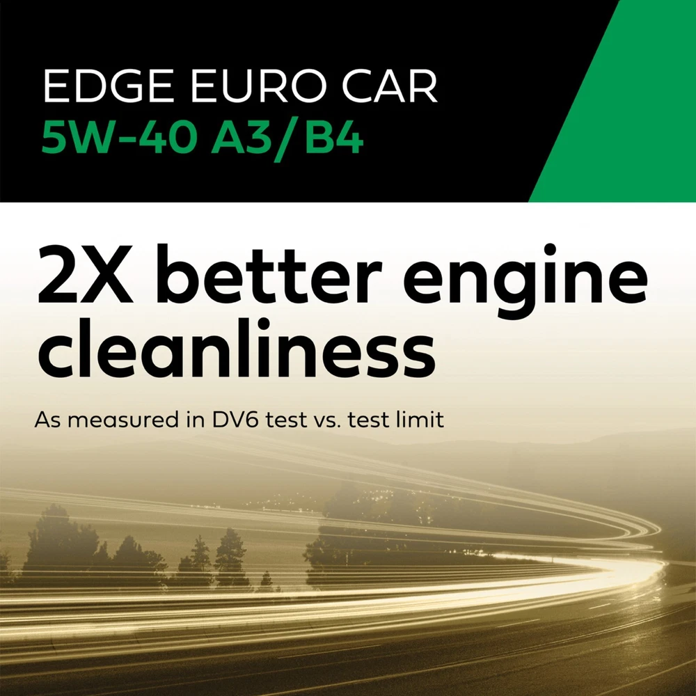 Castrol EDGE Euro 5W-40 A3/B4 is an advanced full synthetic motor oil engineered to exceed manufacturer test limits ensuring the highest level of protection and maximum performance for European cars. European car manufacturers create unique motor oil specifications to ensure the lubricant can withstand the intense pressure, heat and friction generated in a high output engine. To ensure compliance, rigorous engine tests are developed, with approval granted only when the oil achieves the minimum values required in each test. Castrol EDGE Euro Car fluids are formulated to exceed these requirements and deliver maximum protection and performance. 1.2X Better viscosity control to help engines run better for longer* 2X Better engine cleanliness to help maximize engine performance* *As measured in DV6 test vs. test limit Approved and licensed specifications: ACEA A3/B4 API SP BMW Longlife-01 MB-Approval MB 229.5 Porsche A40 Renault RN0700 / RN0710 VW 502 00 / 505 00 Meets engine test requirements of Chrysler MS 12991
