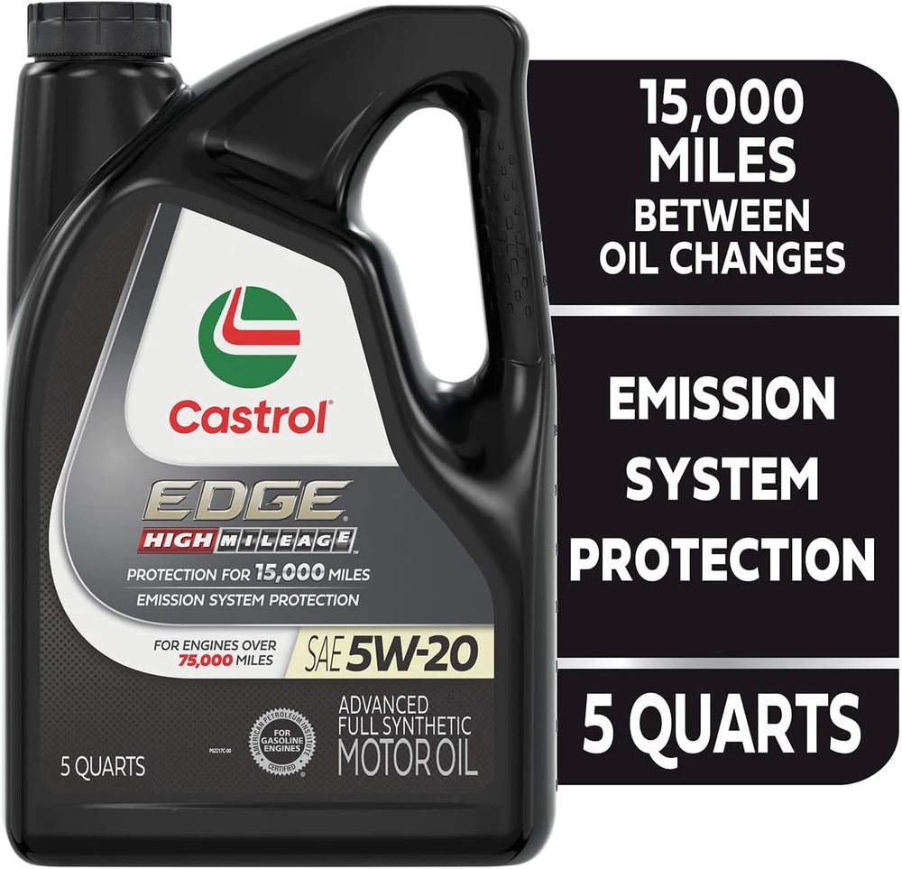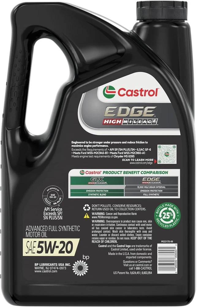 Patented Phosphorus Replacement Technology to help extend the life of your emission system 10X better high temperature performance, as measured in Sequence IIIH engine test vs. API SP test limit 6X better wear protection, as measured in latest Sequence IVA engine test 1.4X better sludge protection, as measured in Sequence VH engine test vs. API SP test limit Meets ILSAC GF-6 to prevent low speed pre ignition (LSPI) and timing chain wear protection Choose Castrol EDGE High Mileage with Fluid TITANIUM Technology for the ultimate performance demands of your high mileage vehicle, especially when operating under extreme temperatures. Castrol EDGE High Mileage surpasses the latest industry standard with an impressive 10 times better high temperature performance, ensuring exceptional protection and optimal oil flow throughout your drive cycle. As your car ages, it may experience a decline in performance and efficiency, and become more susceptible to catalytic converter failure. That's why Castrol EDGE High Mileage is formulated with innovative Phosphorous Replacement Technology, reducing the presence of harmful phosphorus. This helps safeguard your catalytic converter and preserve the longevity of your emission system. With Castrol EDGE High Mileage, your car can defy its mileage limitations and continue to deliver maximum performance. Experience the difference it makes in extending the life and enhancing the performance of your high mileage vehicle.