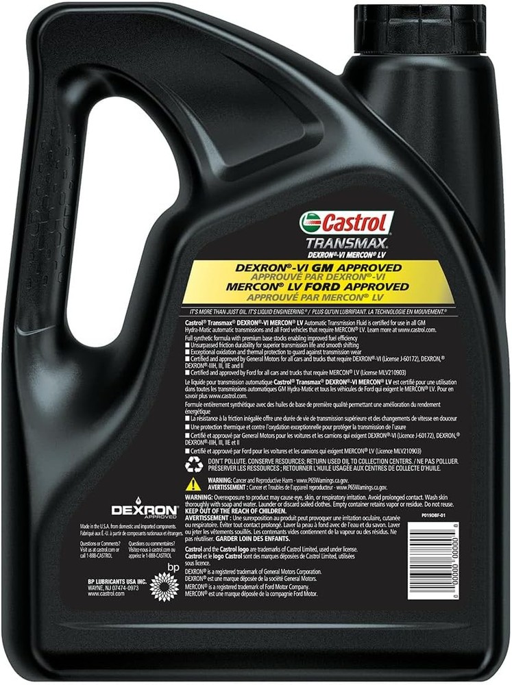 About this item: OEM approved and licensed by Ford (MERCON LV) and GM (DEXRON-VI) Low viscosity formula for maximum fuel efficiency in modern automatic transmissions Enhanced friction durability for smooth transmission performance Superior high temperature protection to resist oxidation Product Description: Castrol® Transmax Dexron® VI Mercon® LV is a premium full synthetic transmission fluid, formulated with Smooth Drive Technology™. It delivers outstanding sludge resistance to provide superior transmission life and enhanced friction to resistance to improve shifting performance. It is certified and approved by General Motors for use in all GM vehicles and by Ford for vehicles requiring Mercon® LV transmission fluid.