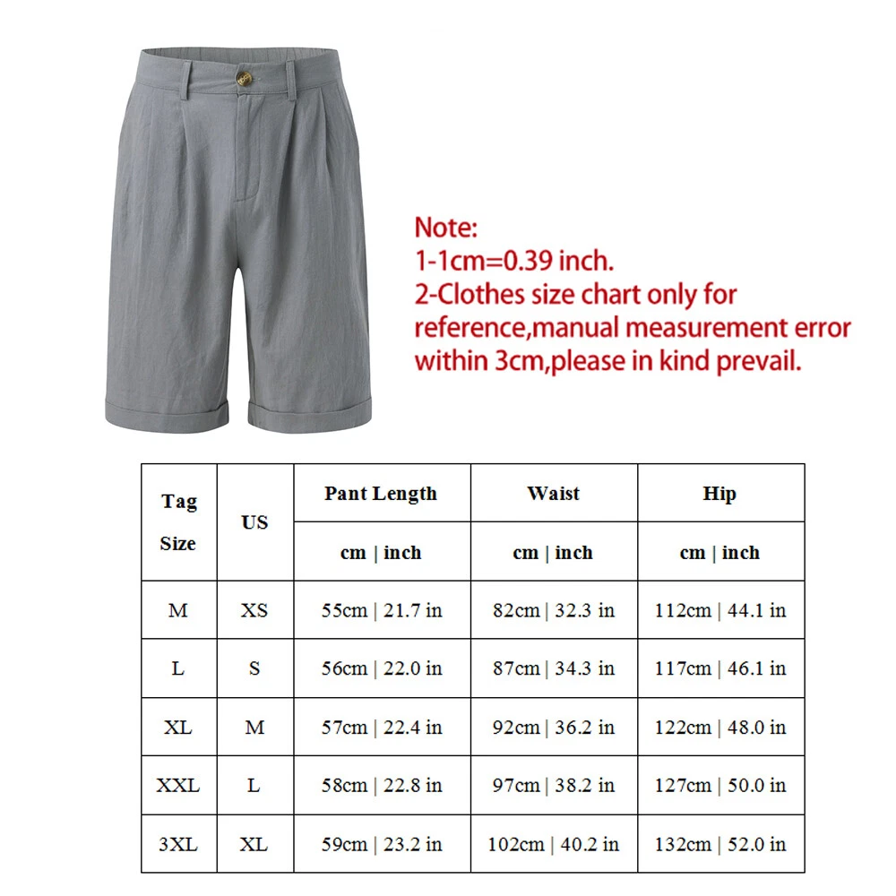Description Feature: 100% Brand new and high quality Style: fashion,casual Size: M,L,XL,2XL,3XL Color: white,khaki,dark blue,green,black,grey Material: cotton,linen Thickness: thin Length: short Pattern: solid Season: summer Occasion: everyday,daily Garment: hand washing or machine washing,line dry. Package:1pcs shorts Note: 1.Due to the light and screen difference, the item's color may be slightly different from the pictures. Please understand. 2.Please allow 2-3% error due to manual measurement.Please make sure you don's mind before you mid. 3.Size doesn's fit all.Please carefully check size chart and select the size based on your real size. On Dec 17, 2024 at 12:56:32 PST, seller added the following information: