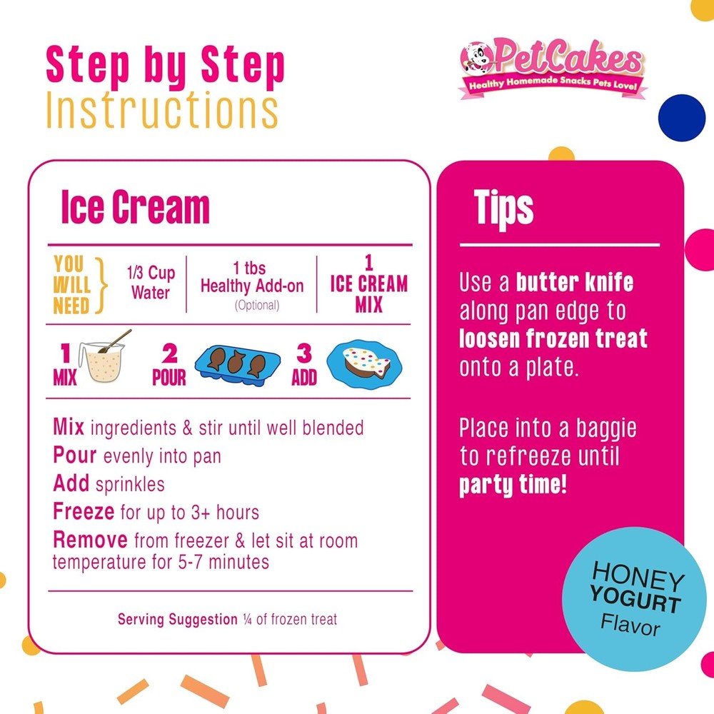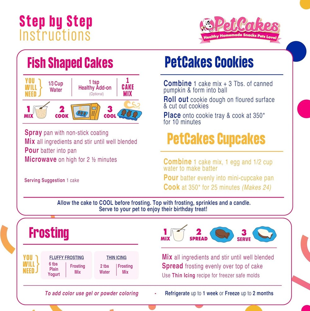 Birthday Baking Kit for Cats- Makes 3 Frosted Fish 14.3 Ounce (Pack of 1) Product Details Item Weight: 0.634 ounces Manufacturer: PetCakes Item Package Dimensions L x W x H: 7.28 x 6.73 x 3.31 inches Brand Name: PetCakes Directions: See Image Label Size: 14.3 Ounce (Pack of 1) Age Range Description: All Life Stages Number of Items: 1 Breed Recommendation: Any Specific Uses for Product: Appetite Stimulation Package Dimensions : 7.28 x 6.73 x 3.31 inches; 0.63 ounces Manufacturer : PetCakes Brand: PetCakes Flavor: Cheese Age Range (Description): All Life Stages Item Form: Powder Specific Uses For Product: Appetite Stimulation Cat cake mix & frosting kit for a tasty birthday cake with ice cream - easy and fun to make at home with your kids! Add water to the cake mix & microwave in the fish shaped cake pan - comes with sprinkles & a candle! Add water to the cat ice cream mix & freeze for just three hours - top with their favorite treats. Quality, human-grade ingredients - free from wheat, corn, and soy. No added sugar, salt or preservatives. 100% USA made - We are proud to make our natural cat treats with quality ingredients here in the USA.