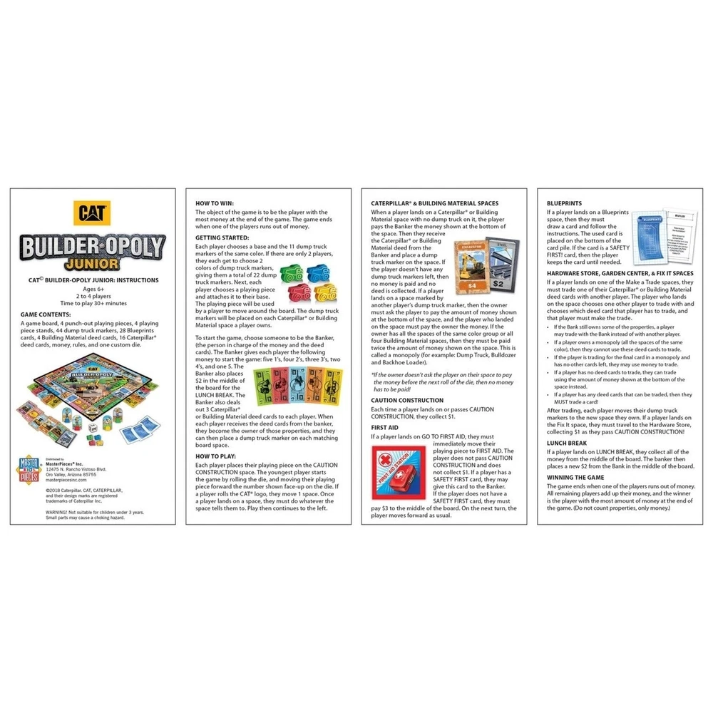 Caterpillar equipment enthusiasts of all ages will love this game! Officially Licensed CAT - Caterpillar Builder Opoly-Junior allows players to collect all the authentic CAT equipment and tools they need to get the job done. From dump trucks, to dozers, and more... all ready to get building according to your blueprints. As you collect equipment, learn awesome facts about each vehicle on the back of the card. Just make sure you dont get injured and have to go to the first aid station along the way. As you collect equipment and vehicles, learn cool trivia about each one on the back of the card. Just make sure you dont end up needing the first aid kit! This game is perfect for kids and adults for family game night and makes a great gift for any CAT fan. It includes a game board, 4 punch Cat Builder Opoly Junior Game Family Board Game For Kids And Adults Caterpillar equipment enthusiasts of all ages will love this game! Officially Licensed CAT - Caterpillar Builder Opoly-Junior allows players to collect all the authentic CAT equipment and tools they need to get the job done. From dump trucks, to dozers, and more... all ready to get building according to your blueprints. As you collect equipment, learn awesome facts about each vehicle on the back of the card. Just make sure you dont get injured and have to go to the first aid station along the way. As you collect equipment and vehicles, learn cool trivia about each one on the back of the card. Just make sure you dont end up needing the first aid kit! This game is perfect for kids and adults for family game night and makes a great gift for any CAT fan. It includes a game board, 4 punch-out playing pieces with plastic stands, 44 dump truck plastic markers, 28 blueprints cards, 18 Caterpillar deed cards, 4 equipment cards, custom money, custom CAT die, and rules. Product Attributes: Weight (lbs.) : 1.75 lb UPC: 705988419003 Brand: MasterPieces