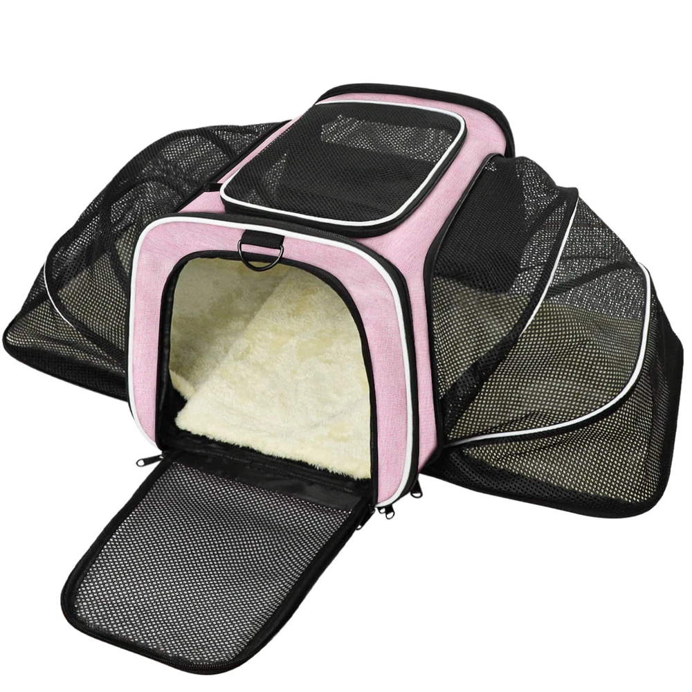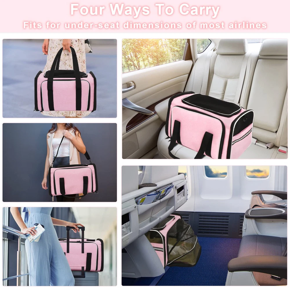 EXPANDABLE SOFT-SIDE CARRIER: Please measure pets before purchasing. pet carrier normal size is 18"Lx 11"Wx 11"H, expandable size is 18" Lx 29.8"W x 11"H by expanding the 2 mesh windows. Fits pet up to 18”L*10”W*10”H, max load of 15lbs (The dogs can not exceed 12 pounds). Please do not choose a pet carrier based on weight, please refer to your pet's length and height to choose the size of the pet carrier (product description)then Make sure pets don't exceed the maximum weight limit. DURABLE MATERIAL: Dog airplane carrier approved designed with microfiber frame prevents the top from sagging, keeping solid and stable even after total expanded. No collapse or deform like other pet travel carrier. EASY to CARRIER: The cat carrier designed with a hard PP pad into bottom, help to hold and increase load beaning, avoid deformation when carry on the carrier. The pad made of suede and polyester, washable and easy to clean.Mesh cloth increase ventilation and decrease anxiety for traveling. Carry the expandable carrier on airplane, car, by hand or shoulder. AIRPLANE APPROVED: Dog travel carrier compliance with airline standard size, fit under the front cabin seat of most airline carriers. Every airline has a specific set of rules and regulations, please contact with airline before flying with your pet. Tips: The pet carrier bag has been upgraded about color, the edge of the previous style is purple, and the edge of the new style is blue. The size and function of the new pet bag remain the same, both colors may be shipped randomly. PLEASE NOTE INTERIOR SIZING & PET MEASURING GUIDELINES BEFORE PURCHASE : PLEASE KEEP IN MIND that we show the exterior dimensions as well as approximate interior dimensions to best portray the usable interior space for your pet. The interior space will be less than exterior due to the fabric thickness and plush faux fleece padding.NOTE: Not suitable for large sized dogs.