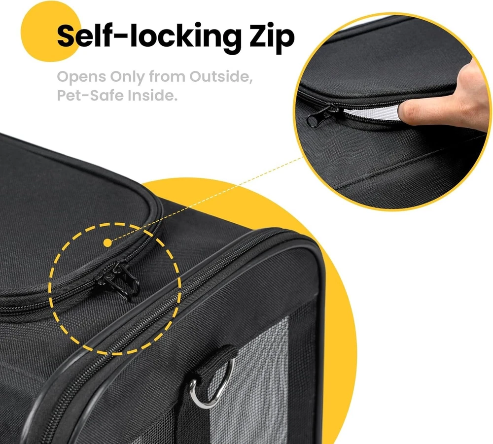 SIZES & WEIGHTS: Airline-approved, this cat carrier measures 17 x 11 x 11inches and is recommended for pets weighing less than17 Lbs.Choose the carrier based on your pet's length and height, not just weight.If your pet is still growing, we recommend purchasing a larger size to avoid tedious exchanges.Travel in style with your furry friend using this lightweight cat carrier bag! DOUBLE SAFET:This pet carrier is made of durable polyester and steel frame with Velcro closure. You can also fasten the zipper cord to the shoulder strap hook for extra safety.There's even a safety leash inside to keep your pet comfy and secure. BREATHABLE & CONVENIENT:The cat carriers with an openable top and three-sided mesh windows provide fresh air and a view, reducing pet anxiety and keeping them comfortable. External pockets allow easy storage of food, leashes, bags, and other pet essentials. EASY TO CLEAN: The travel cat carrier is designed to resist dirt, and comes with a removable fleece mat that can be hand-washed or machine washed. Any stains or dirt on the bag's surface can easily be cleaned with a soft brush. PORTABLE & FOLDABLE - This cat cage carrier can use the padded shoulder strap or the loop handles to carry it as a tote or shoulder bag, and the strap is adjustable.The collapsible design means you can fold it up nice and small for effortless storage.