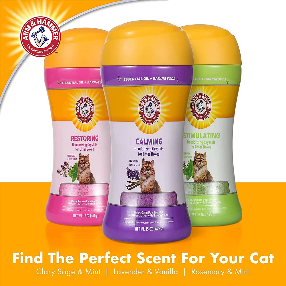 ODOR NEUTRALIZER CAT LITTER CRYSTALS – Arm & Hammer Cat Crystals work as a powerful scented cat litter odor eliminator to control unwanted cat smells, keeping your kitty litter box and home fresh and clean for your cats with zero mess. ARM & HAMMER BAKING SODA – Featuring the trusted Arm & Hammer Baking Soda, this cat crystal deodorizer neutralizes cats litter odors with a blend of essential oils, leaving your home fresh. It's perfect for keeping your pet’s litter box free from smells. EASY TO USE – Sprinkle these dissolvable scented cat litter crystals over the kitty litter box to easily control odors and maintain a clean, fresh environment for your cat litter. No additional cleanup is needed, and it helps prevent lingering pet smells. DISSOLVES OVER TIME – Arm & Hammer cat crystal deodorizer slowly dissolves over time, absorbing and eliminating pet odors in your cats litter. With no need for extra cleanup, your kitty litter box remains tidy and free of lingering smells. CALMING SCENT – The calming combination of lavender and vanilla in this scented cat litter deodorizer helps relax pets while neutralizing odors in cats litter. It leaves the room smelling fresh, perfect for both your home and pet environment. Arm & Hammer Deodorizing Cat Litter Crystals are a convenient, easy, and fresh way to help maintain your cat litter box. Cat litter crystals are the perfect addition to any litter box and are sure to make a noticeable difference in your pet household. Litter box crystals work as litter box deodorizers to create a wonderfully fresh and hygienic litter box that conceals odors. The Arm & Hammer baking soda ingredient mixed with essential oils helps with odor control while it works. These cat litter crystals will ensure that your litter box and the area around it always smells fresh. Arm & Hammer Deodorizing Cat Litter Crystals come in calming, restoring, and stimulating scents to instantly freshen your home with pets. Best of all, the cat litter deodorizing crystals dissolve over litter so you don't need to worry about cleanup!Crystal litter odor eliminators for home cat litter boxes are great for helping neutralize cat odors in the home. This Arm & Hammer baking soda product helps with cat odors in and around the litter box. In addition to using these cat litter deodorizing crystals, some pet parents also choose to use odor neutralizing gel beads like Arm & Hammer Pet Scents for the home. Odor beads are different from cat litter crystals for cat litter odor elimination. A cat litter odor eliminator like this one can go in all types of litter boxes. Find the best scent for your needs with Arm & Hammer for pets.YOUR SATISFACTION IS OUR PRIORITY. For any questions or feedback, please reach out to us at Fetch for Pets.