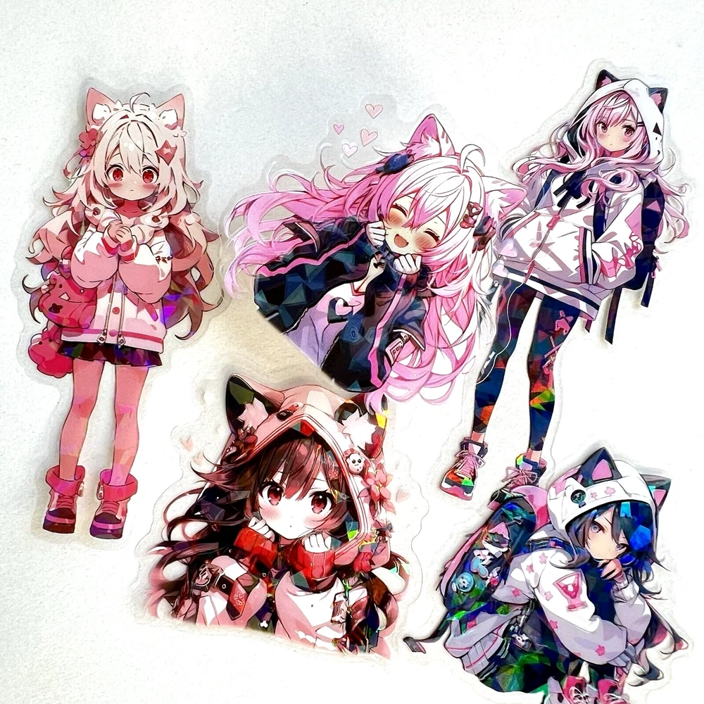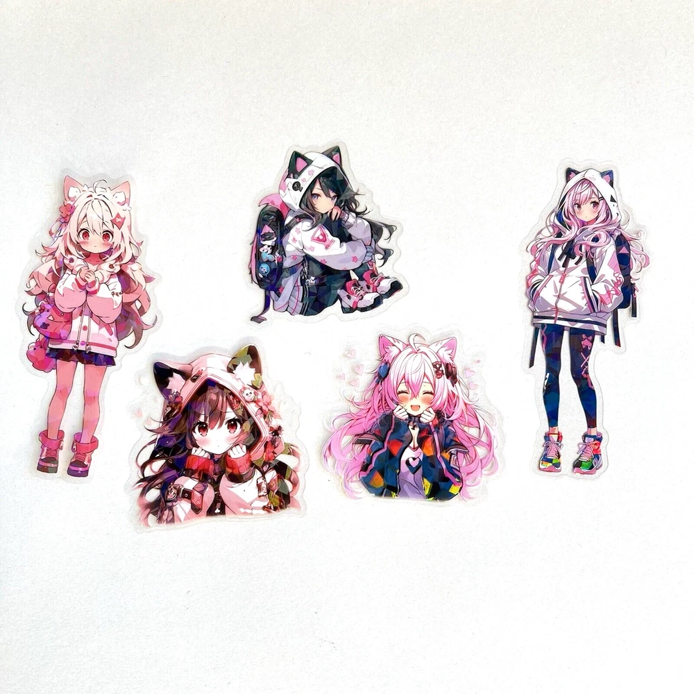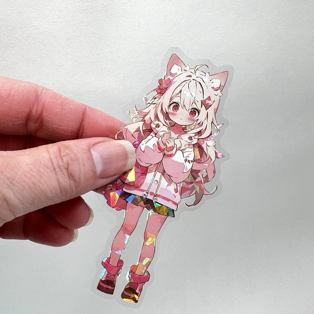 10 stickers. 5 designs x 2. The sticker in the last photo is approx. 3 7/8 inches tall. Holographic with areas of raised ink for a 3D effect. These are PET flake stickers (image printed on a thin clear flexible plastic with a clear peel off backing). I have more stickers, washi tape and paper for sale. I do combine shipping. Please put all the items you want to purchase in ONE cart and then pay. I will refund you the difference in shipping after shipping label is printed. Let me know if you have any questions through eBay messaging. Thank you for stopping by!