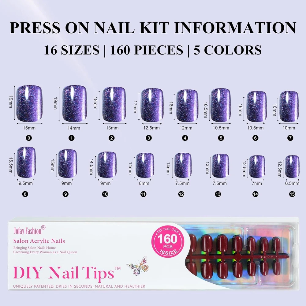 【New Upgraded Salon Effects】The set contains 5 newly upgraded salon effect short press-on nails, a total of 120 pcs winter style 3D light-chasing cat's eye nails, dark red/dark purple/dark blue, brown-red and olive green with chameleon effect, each color is very special, velvety texture of fine flashes create luxurious charm, very suitable for various winter combinations. 【High Quality & Durable】Full coverage false nails are made of high quality acrylic material and soft gel, the nail tips are elastic and durable, not easy to break. The surface of the fake nails is coated with a high-gloss protective gel, which is not easily worn out even after repeated use. 【Natural & Comfortable】Jofay Fashion acrylic nail tips are of moderate thickness, and the tapered cuticle design fits the edge of the nail better, giving a comfortable and natural effect without placing a heavy burden on the nail bed. 【Press On and Go】The fake nail set is small, lightweight and easy to carry, so you can quickly change your nails anytime, anywhere, whether you are traveling or on a business trip. Reusable short glue on nails are a great choice for travel/home manicure. 【Perfect Gift for Women】 Gel nail press ons are very suitable for many social occasions such as weddings, proms, dates, and also suitable for Valentine's Day, Halloween, Christmas and other festivals. These holiday nails are the perfect gift for girlfriends, wives, women and girls.