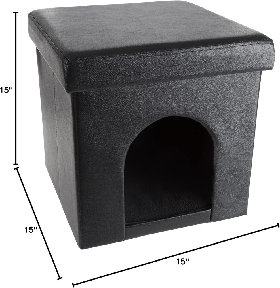 About this item PET OTTOMAN – With a cushioned top and faux leather exterior, this dual cat cubby ottoman delivers a pleasant and snug place for your four-legged friend to relax or sleep, and a comfortable place for you to rest your feet. A CAT NAPPER’S DREAM – The cat cube has an opening for your pet to use it as a covered cat bed and includes an inner removable pillow insert that is warm and cozy for them to relax in comfortable privacy. SPACE-SAVING DESIGN – The compact design of this small cat bed allows you to easily use it in any room in your home, without having to sacrifice too much space. The indoor cat house collapses to just 3.5-inches tall for easy storage or travel. REINFORCED BOTTOM – The bottom of the cat home is reinforced for stability and support. The sturdy construction on this cat bed cube can not only support your feet on top, but also sustains pet activity like jumping, playing, and more. PRODUCT DETAILS – Materials: PVC Faux Leather. Dimensions: (L) 15” (W) x 15” (H) x 15”; Folded: (H) 3.5”. Total Weight Capacity of Cat Cave Bed is 100lbs. Color: Black. Brand: Product Dimensions: 15"D x 15"W x 15"H Material: PVC Faux Leather Color: Black Style: Faux Leather