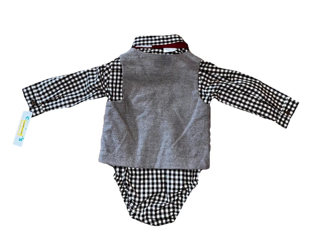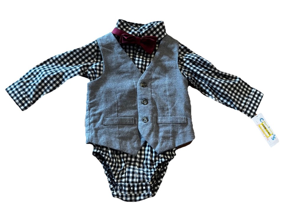 The Cat & Jack Baby Boys 3-Piece Set includes a plaid button-down vest, bow tie, and long sleeve shirt in size 18M. This outfit is perfect for various occasions such as parties, casual wear, or formal events. The set features a multicolor design with accents like buttons and a bow, making it a stylish and versatile choice for young boys. Easy to care for with machine washable fabric, this outfit is suitable for all seasons and includes elements like a vest and bow tie to complete the refined look for your little one.