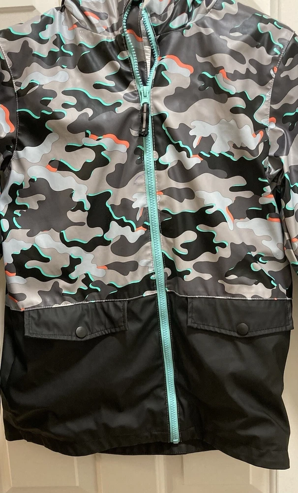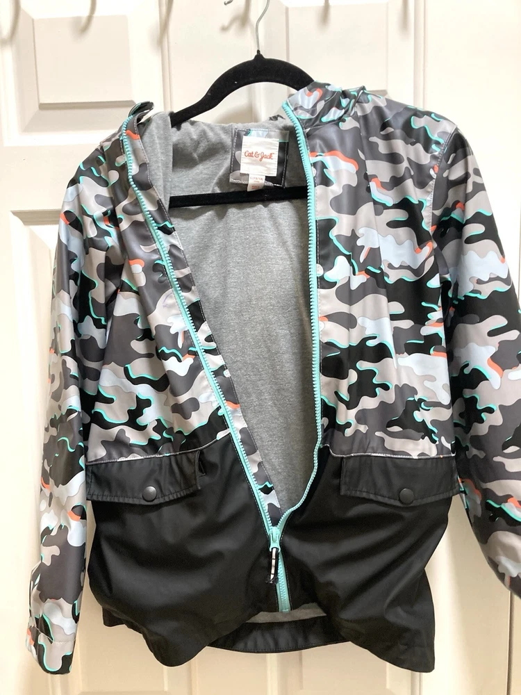 CAT & JACK BOYS Camo Hooded Rain Jacket Size Large 12/14 Measurements approx. Pit-Pit: 18 inches Length: 24 inches **FLAWS** (see last 3 pics) There are 2 very small fading spots from wear and washing. There is an ink pen mark on the front. NO rips or tears. Other than the 3 small spots the rain jacket is in great preowned condition.
