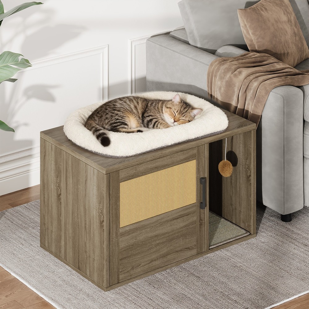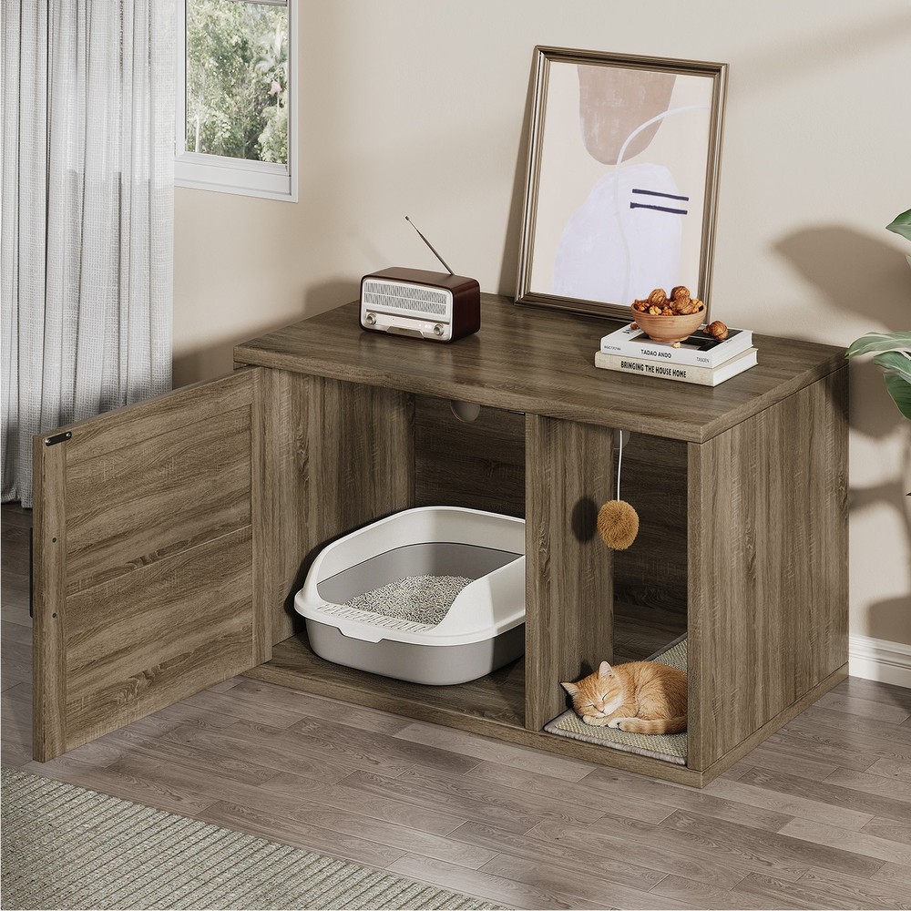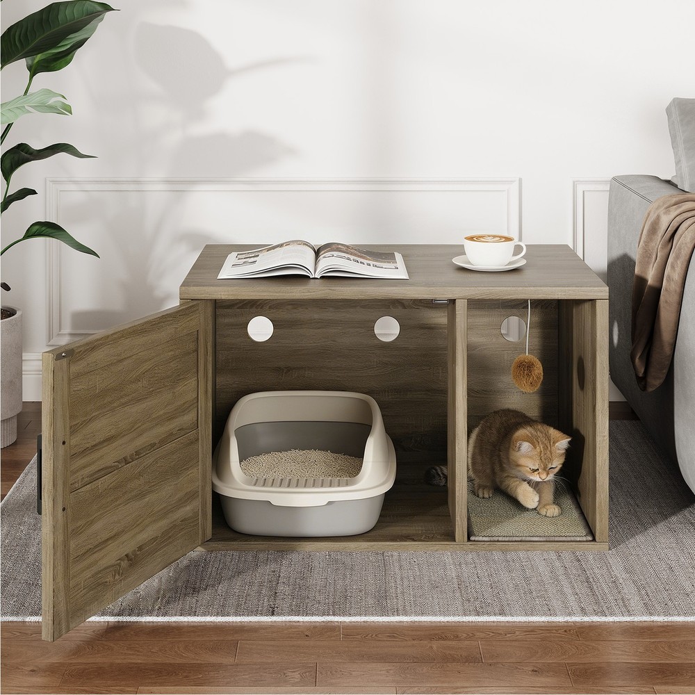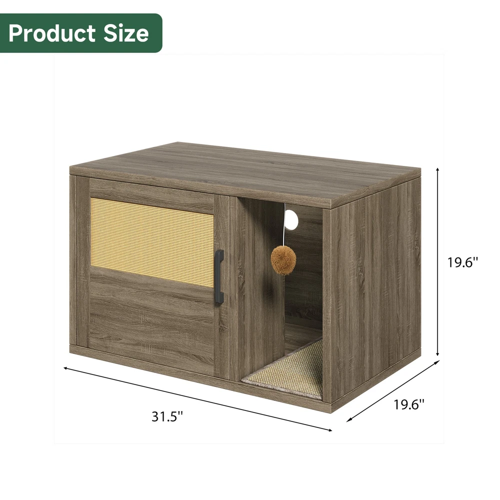 Feature: 1. Multifunctional Design: Used as a litter fence or house for your cat. It can also serve as a stylish side table, suitable for placing books, crafts, or other items, combining functionality and style seamlessly. 2. Odor Control: This cat litter box furniture is designed to provide your cat with a private metabolism space, helping to control odors and suitable for most litter boxes, ensuring a fresher home environment. 3. Entertainment Needs: The entrance of this enclosed cat litter box features a scratching pad, allowing cats to enjoy their nature scratching instinct as they enter. 4. Sturdy and Stable: Made of high grade chipboard and premium metal frame, the cat litter box is more durable and secure, ensuring high safety standards. 5. Easy to Assemble: Clear instructions, assembly tutorials, and all necessary tools are included in the package for easy installation in a short amount of time, with minimal assembly difficulty. Specification: Item Type: Cat Litter Box Enclosure Size: Approx. 80x50x50cm / 31.5x19.69x19.69in Material: Particle Board Door Number: 1 Package List: 8 x Boards 1 x Pad 14 x Accessory Pack 1 x User Manual Note: