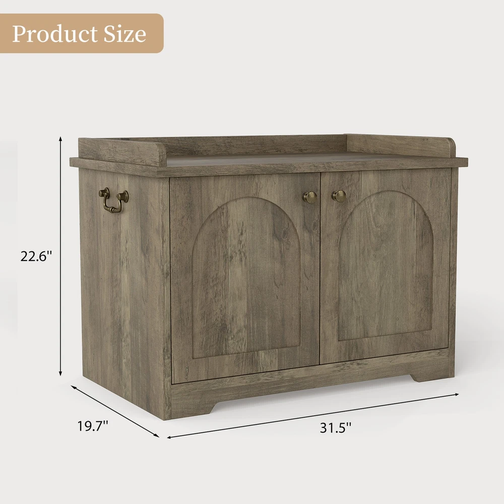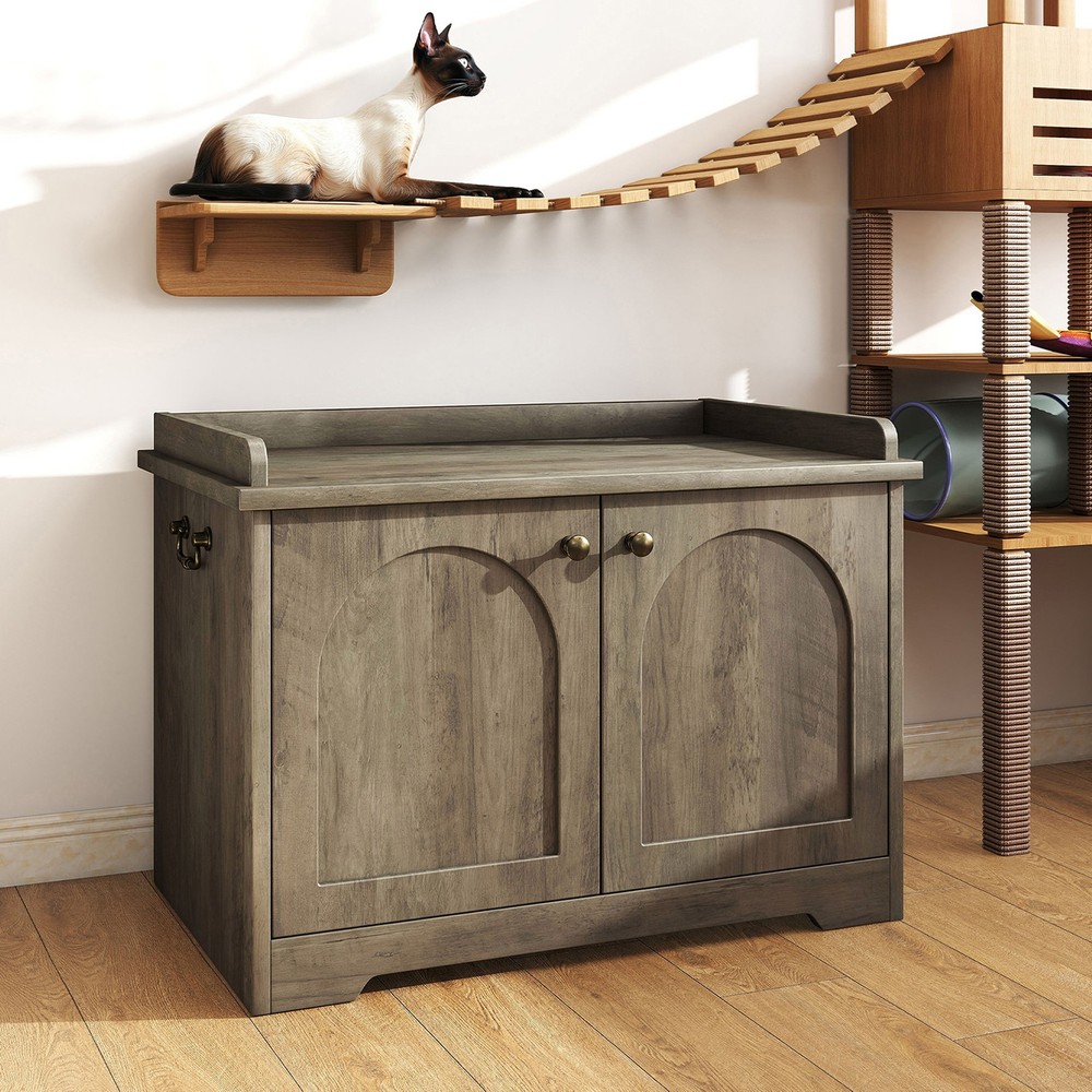 Feature: 1. PET FRIENDLY DESIGN: This cat litter box enclosure provides a private bathroom space for your feline friend. Add a litter box inside and create a cozy, quiet corner with a cat bed and toys, giving your kitty the excellent place for napping and relaxation. 2. ODOR CONTROL: Designed to offer your cat a dedicated area for their needs, this litter box furniture helps suppress unpleasant odors. It fits most litter boxes and keeps your home smelling fresher, while also preventing litter spills and messes. 3. MULTI FUNCTIONAL: This cat house serves dual purposes, not only is it a litter box barrier, but it also functions as a cat house. With its stylish furniture aesthetics, it can easily double as a side table or coffee table next to your sofa, providing a practical place for books, decor, or other items. 4. STURDY AND STABLE: Crafted from high strength boards, this pet box enclosure is both robust and enduring, ensuring safe usage for your pets. Its double cabinet doors allow for easy access when refilling cat food or cleaning up, enhancing convenience for pet owners. 5. COMPREHENSIVE KIT: The kit includes clear instructions, all necessary tools, and hardware for easy assembly. This wooden cat house transforms untidy areas into neat, cozy spaces, providing your cat with a private place to do their business without compromising your home's aesthetic. Specification: Item Type: Cat Litter Box Enclosure Furniture Size: Approx. 80x56x50cm / 31.5x22.05x19.69in Material: Boards Doors: 2 Package List: 13 x Boards 1 x Scratching Pad 13 x Accessories Pack 1 x Instruction Manual Note: