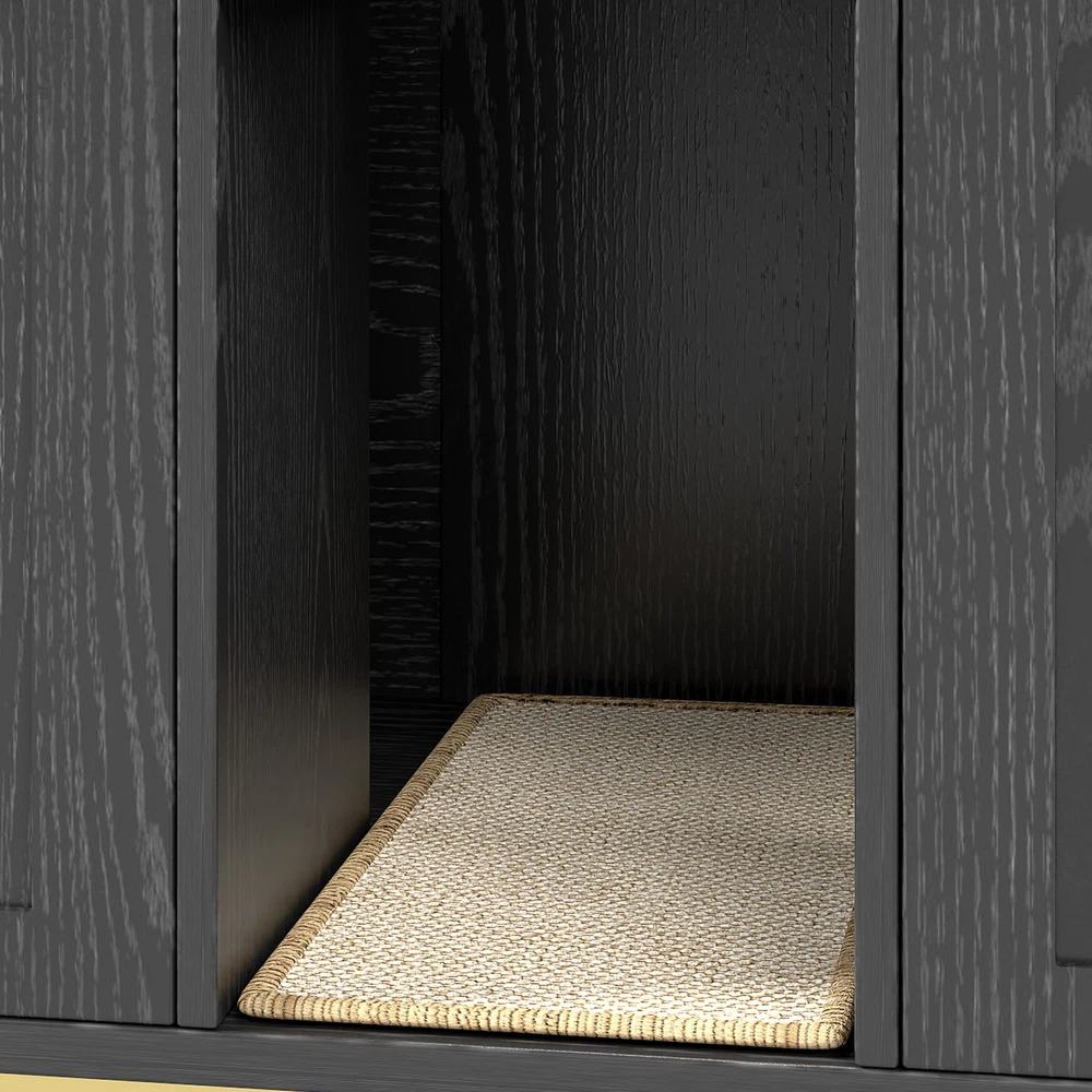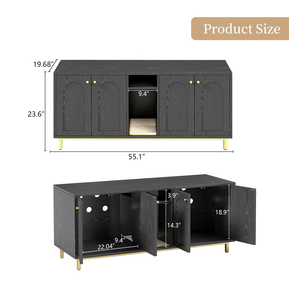 Feature: 1. Spacious Room Design: Our luxurious double cat room design offers ample space for two cats to comfortably use at the same time. This spacious design ensures that both of your furry friends have enough room to feel relaxed and secure. 2. Integrated Scratching Pad: This litter box is equipped with a built in scratching pad, allowing your cats to indulge in their nature scratching instincts as they enter. 3. Multifunctional Furniture: Our large wooden cat litter box serves a dual purpose as a cozy cat house and a stylish piece of furniture. It prevents dogs from accessing the litter area while seamlessly blending in with your home decor, functioning as a TV stand or side table. 4. Magnetic Double Door Design: The innovative magnetic double door design simplifies daily cleaning and litter replacement. The thoughtfully engineered entry mechanism allows your cats to enter with ease, while ensuring proper ventilation and ample light inside. 5. Rugged And Easy To Clean: Made from particle board, this enclosure is built to last and withstand everyday use. The ten small holes at the back effectively eliminate odors, while the easy to clean wooden surface ensures that maintenance is quick and efficient. Specification: Item Type: Cat Litter Box Enclosure Size: Approx. 140 x 60 x 50cm / 55.12 x 23.62 x 19.69in Color: Black Material: Particle Board Doors: 4 Package List: 14 x Boards 2 x Iron Bars 2 x Iron Frames 1 x Scratching Pad 18 x Accessory Packs 1 x Base Fixing Device 1 x Manual