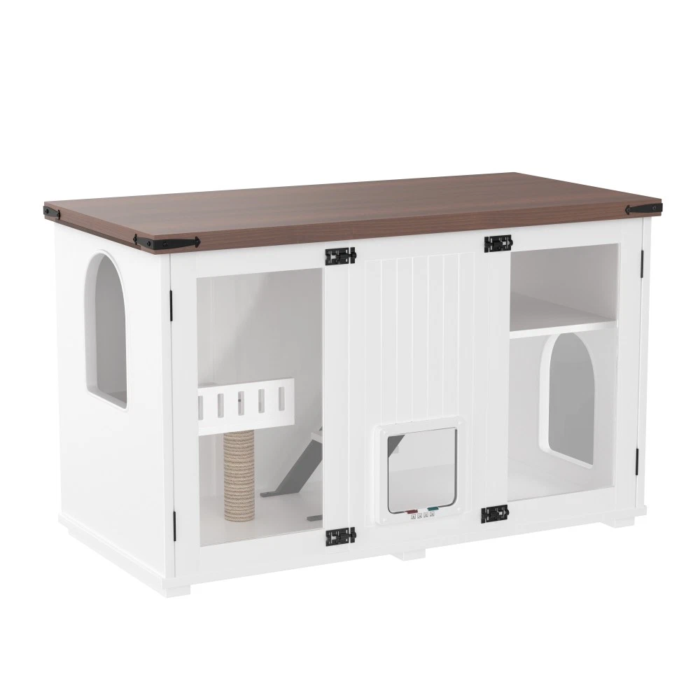 47.25" Large Cat Litter Box Enclosure with LED Light, Hidden Litter Box Furniture, Cat House with Stairs and Scratching Post, White ✨ Premium Cat Litter Box Enclosure for Large Cats | Multifunctional Hidden Furniture | 1-Year Warranty & 30-Day Free Return ✨ Tired of unsightly litter boxes ruining your home decor? Fed up with odors and dog distractions? Our 47.25" Large Cat Litter Box Enclosure is the perfect solution to blend pet needs with your living space style. Designed for large cats (41-70 lbs), this all-in-one hidden litter box furniture combines odor isolation, cat play space, and home storage—making it a must-have for cat parents who value both functionality and aesthetics! 📌 Key Specifications Pet Compatibility : Suitable for Large Cats (41 - 70 lbs) Material : High-Quality Acrylic & Engineered Wood (PB Board) – Sturdy & Durable Color : Sleek White – Matches Any Home Decor Assembled Dimensions : 47.20"L x 22.00"W x 27.70"H | Weight: 72.69 lbs Packaging Dimensions : 52.50"L x 25.25"W x 7.00"H | Weight: 76.06 lbs Load Capacity : Top Surface Supports Up to 110 Lbs 🌟 Why Choose Our Cat Litter Box Enclosure? ✅ Multifunctional Design for Home & Pet Accommodates 1-2 litter boxes, effectively isolating odors and preventing dogs from disturbing your cat during use. The large top surface doubles as a chic side table or coffee table—perfect for placing cat food, toys, books, or decorative items. Keep your living room neat, organized, and stylish without sacrificing pet comfort. ✅ Thoughtful Multi-Area Layout This hidden litter box furniture features a well-divided structure: 2 spacious upper platforms for cat beds or toys, a lower compartment for the litter box, and a middle area with a scratching post and stairs. Your feline friend can play, exercise, rest, and take care of business all in one place—满足ing their natural instincts and needs. ✅ User-Friendly Details for Convenience Equipped with a high-definition acrylic door, you can easily monitor how often your cat uses the litter box, ensuring timely cleaning. The built-in soft LED lighting allows your cat to move around safely and comfortably even at night, no more stumbling in the dark! ✅ Smart 4-Mode Locking Door Customize your cat's entry and exit with 4 adjustable modes: No Entry & No Exit, Both In & Out, Only In & No Exit, Only Out & No Entry. Perfect for various scenarios—whether you're cleaning the litter box, feeding time, or letting your cat roam freely. Manage your pet effortlessly with maximum flexibility. ✅ Durable & Easy to Maintain Crafted from high-quality PB board, this cat cabinet is sturdy and wear-resistant, built to last. The transparent acrylic door is shatter-resistant and lightweight for easy opening. Cleaning is a breeze—wipe common stains with a damp cloth, and open the cabinet door to quickly access and clean the litter box. All boards and components are numbered for hassle-free assembly. 🛡️ Trusted After-Sales Guarantee We stand behind our products! Enjoy 1-Year Quality Warranty for this cat litter box enclosure—if you encounter any quality issues within 1 year of purchase, we'll provide free replacement parts or repair services. Plus, 30-Day Free Return Policy —if you're not satisfied with your purchase for any reason, you can return it for a full refund within 30 days, no questions asked. 📦 Package Includes 1 x 47.25" Cat Litter Box Enclosure (White) | All Assemble Components | Detailed Instruction Manual Upgrade your home and cat's lifestyle with this versatile, stylish, and practical litter box enclosure. Order now and give your feline friend a private, comfortable space while keeping your home clean and elegant! Note : Designed for indoor use. Suitable for 1-2 large cats or multiple small cats. Litter box not included.