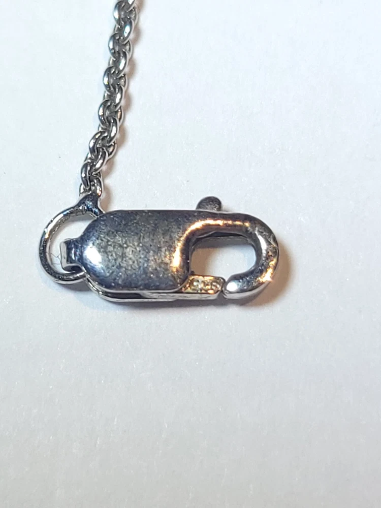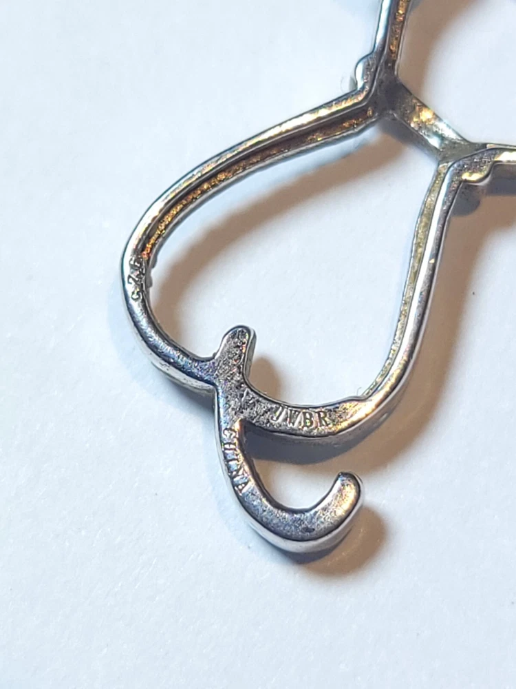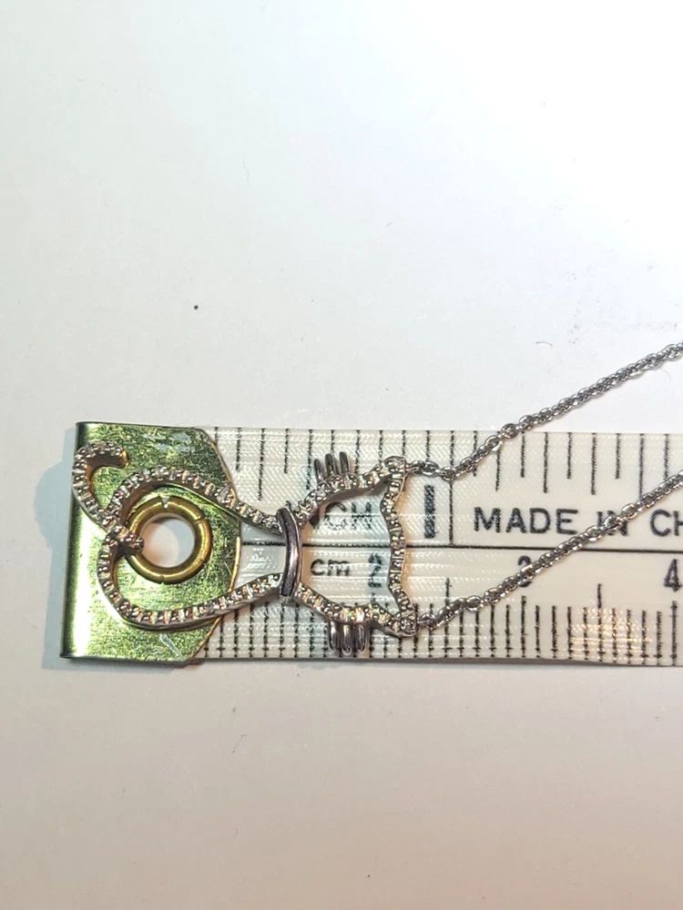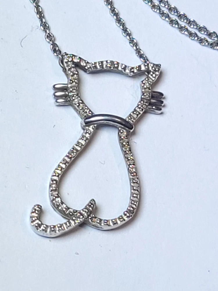 This necklace features a charming cat-shaped pendant made of sterling silver. The pendant is adorned with tiny sparkling diamonds, adding a touch of elegance to the piece. The necklace comes on an attached 18.5" chain and features a lobster closure marked "925 Italy. " This cat necklace is a stylish and whimsical accessory for any cat lover or animal enthusiast looking to add a playful touch to their outfit.