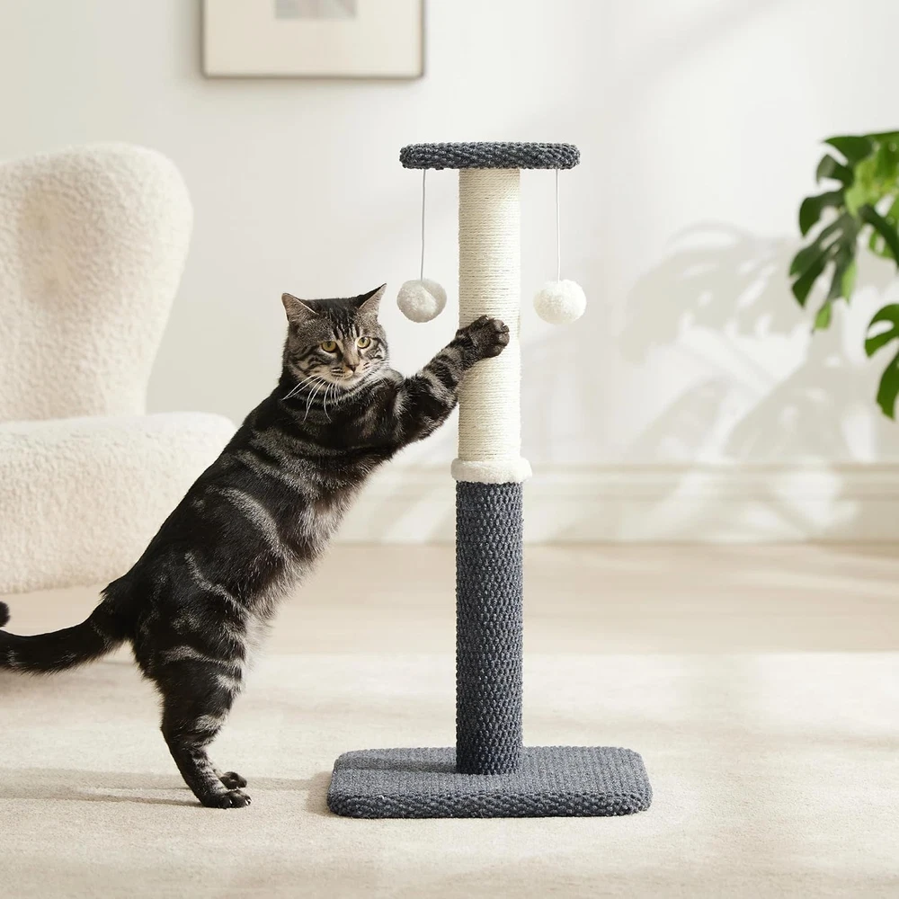 Engage Your Feline Friend: Our cat scratching post is thoughtfully designed with a thick support pipe wrapped in durable sisal twine and covered in carpet fabric, providing endless opportunities for your cat to scratch and sharpen their claws. From top to bottom, this scratching post offers feline fun at every level. Plus, it comes with two interactive pompoms to add extra excitement to playtime. Your cat will love it! Built to Last: The scratching post features solid construction with sturdy materials and a pet-safe carpet covered base, making it resistant to scratching and highly durable. The sisal twine used for wrapping ensures that this post can withstand even the toughest claws. Additionally, the wide and thick base, made from a premium wooden board, adds extra stability to the design. It's a reliable choice for your cat's play and scratching needs. No More Claw Marks: Our scratching post satisfies your cat's natural instincts to scratch while protecting your furniture. Your feline companion will enjoy using this post for exercise and stress relief, while you can rest assured that your valuable furniture remains unharmed. It's a win-win situation for both you and your cat. Enhanced Stability & Security: The wide bottom base, crafted from a premium wooden board, adds extra weight and prevents the cat scratching post from wobbling or tipping over during vigorous play. The post itself is wrapped with high-quality, natural sisal, which is not only environmentally friendly but also safe for your beloved pet. With our design, you can have peace of mind knowing that your cat's safety is the top priority. Customizable & Easy Assembly: Create the perfect scratching post for your cat with our DIY design. You have the freedom to assemble the post according to your preferences. With its simple and quick assembly process, you can have the scratching post ready within just 2 minutes. Enjoy the convenience and flexibility of setting up a personalized play area for your furry friend.