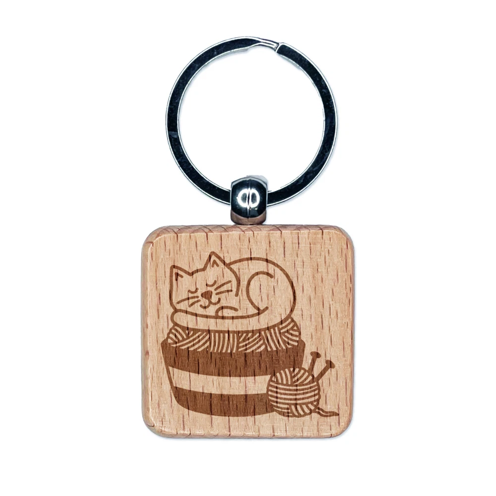 Cat Sleeping on Basket of Yarn Knitting Engraved Wood Square Keychain Tag Charm