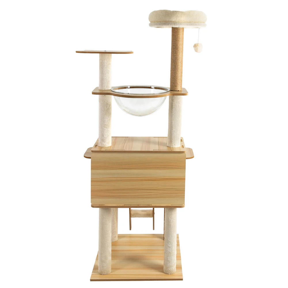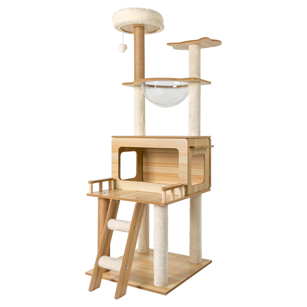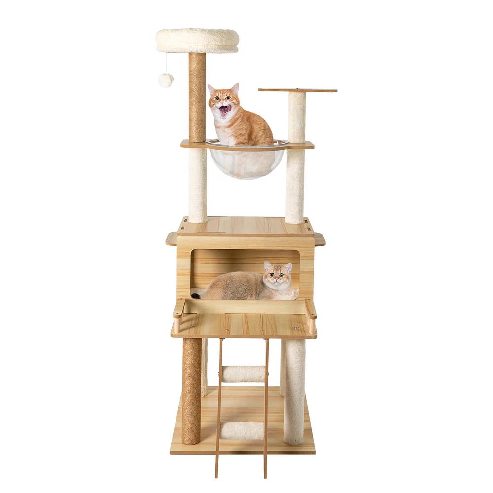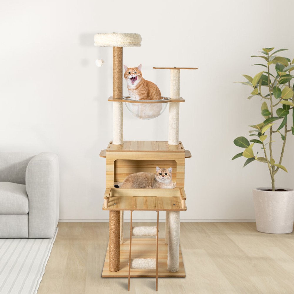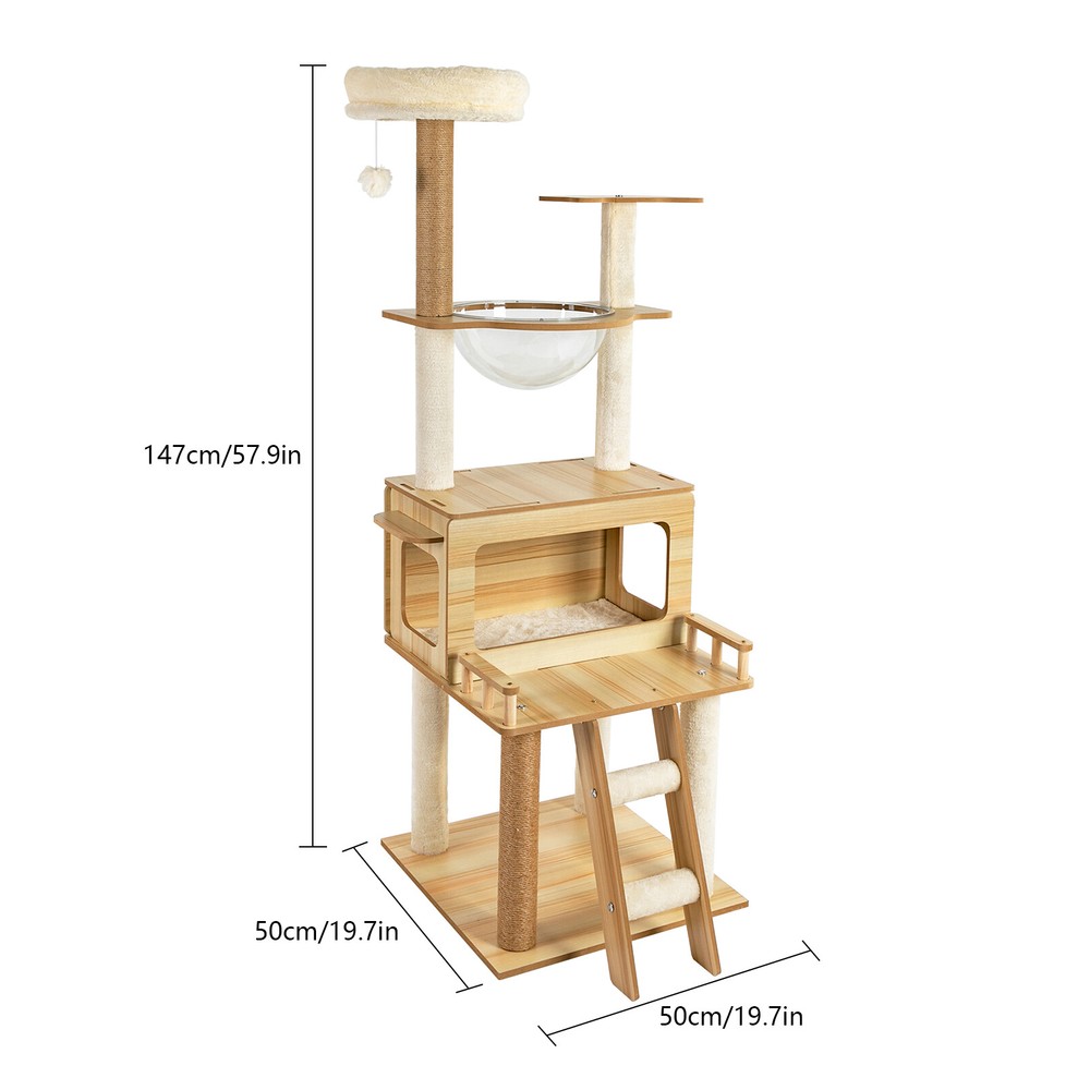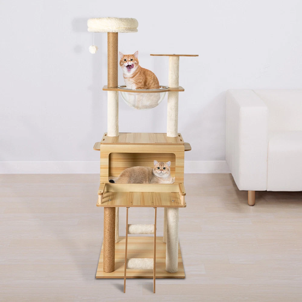 Cat Tree with Climbing Steps and Swing Ball, MDF Cat Tree, Cat Scratching Post Description If your cat is listless all day and scratches the furniture at any time, let's take a look at our cat tree! It can bring your cat a comfortable and pleasant place to play and rest. The sturdy construction and high-quality material ensure the safety of your cat and extend the life of this product. It has a cute appearance that you can send to your friends or family who love cats. Key Features Build to Last: Sturdy MDF and cardboard tube, soft flannelette, wear-resistant and scratch-resistant hemp rope, and the veneering process make it very safe and comfortable for cats and can perform well for a long time. Multiple Functions: The spacious cat tree expands the available area and provides a comfortable space for cats. It comes with scratching posts, wide platforms, a space capsule, cat nests, and a play ball for your cat to scratch, play, and sleep on this cat tree. This will make your cats more lively. With it, your pet can enjoy exploring and sniffing around their new home without scratching your furniture, carpet, clothes, and more. Good Helper: The hemp rope covering multiple pillars helps unleash the nature of cats, cultivate cats' interests, relieve their loneliness and anxiety, help sharpen their claws, improve their physical and mental health, and better promote their growth. Comfortable Experience: The acrylic space capsule with high transmittance and a concave fluid design that allows you to view your cat fully. In addition, it can satisfy the habit of cats curling up to sleep and better protect their spine. It can also let cats see the scenery outside. Soft nest pads make cats more comfortable, even in cold winter without worrying about cats getting cold. Eye-catching Appearance : It combines natural log color with chic white and has a cat-shaped platform, so this item can easily blend in with most home styles and upgrade your space. Strong Load-bearing Capacity: The sturdy material and stable square base (19.7*19.7 inches) with non-slip pads endow the product with a load-bearing capacity of approximately 22 lbs, making it suitable for use by the vast majority of cats. Assembly in a Breeze: Complete accessories, pre-drilled holes, a detailed English installation diagram, and a simple structure allow you to complete the assembly in a very short time to let your beloved pet enjoy the comfort! Space-saving: This product fully utilizes vertical space and covers an area of only 19.7*19.7 inches, so you can freely place it in the living room or other corners. Ideal Gift: With a cute appearance and practical functions, it is an excellent gift for family, friends, and lovers who love or have cats. Guaranteed Customer Service: We aim to provide quality products and services. If you have any problems, please feel free to contact us. We will reply and solve the problem for you as soon as possible. Details Climbing Steps : Multiple steps allow even elderly cats and cats with limited mobility to easily climb up and down. Round Corners: The round edges without any sharpness and burr avoid hurting the cat's claws, thus improving the safety and comfort of use. Application It is suitable for all kinds of cats less than 22 lbs to jump, scratch, sleep, climb, play, etc. You can place this cat tree in your living room, bathroom, balcony, playroom, study room, pet shop, and so on. Specifications Material: MDF, Cardboard Tube, Flannelette, Hemp Rope, Acrylic Surface Treatment: Veneering Color: Log Color, White Style: Modern Uses: Indoor Model: b35 Target Species: Cat Assembly Required: Yes Mount Type: Floor Mount Load-bearing Capacity: About 10kg/22 lbs Product Size: 50*50*147cm/19.7*19.7*57.9in Package Included 1* Cat Tree 1* English Installation Diagram All Accessories for Assembly Notes If the product is scratched or damaged by the cat's paws, please repair or replace it before continuing to use it to avoid further harm to your cat. Cats have a high level of vigilance toward new things. You can use their favorite toys to lure them a little, and they will quickly become familiar with and like this product. Because cats like to jump and play, for safety, we recommend that you connect this product to a wall to enhance stability. Please allow the slight color difference caused by the shooting light and 1-3cm error due to manual measurement, and make sure you do not mind before you order. Payment Delivery details Terms of sales About us Contact us Payment We accept ebay payment 。 Fees such as import duties, taxes are not included in the item price or shipping costs. These charges are the buyer's responsibility. Delivery details Shipping: 2-9 working days to: USA Terms of sales We maintain high standards of excellence and strive for hundred percent customer satisfaction. Feedback is very important to us. We hope that you contact us immediately before you give neutral or negative feedback, so that we can address your concerns. It is impossible to address issues if we do not know about them! About us Your satis faction is our ultimate goal. We work hard to earn your trust and future business. Our certified technicians have tested each item before shipping. The unit comes with 1 year limited warranty on all manufacturing defects. a) If you receive a defective item, you may return it or ask for a discount. Please contact us within 14 days after you receive the package. b) What you returned must be intact and in its original packaging as re? u. Customer is responsible for shipping costs of the returned item. c) We will cover the cost of shipping back t with the shipping rate indicated in the registration page. We will send you a new unit or refund the full payment you paid. Thank you. Contact us Business Hour Business Hour: Monday To Friday: 8:30 AM to 5:00 PM (Beijing China time) Due to time zones, our reply to your questions may not be immediately. But within above working time, we will reply your email within 24 h