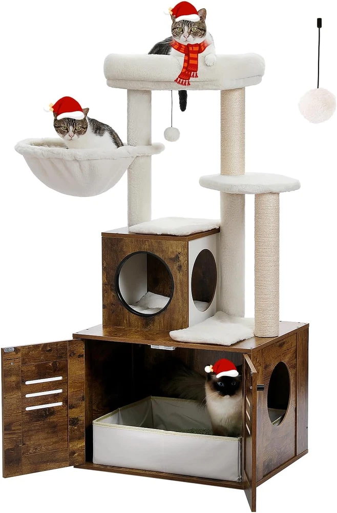 Cat Tree with Litter Box Enclosure, 50-Inch All-In-One Modern Cat Furniture for