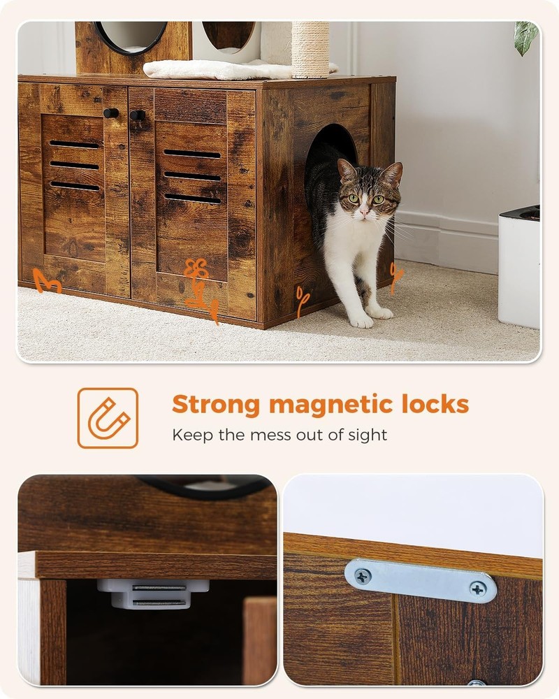 [Heavier & Sturdier]: Compared to 99% of wooden cat trees with litter box furniture on the market, our modern cat tree with scratching posts is heavier and made with more material, making it exceptionally long-lasting. With its lower center of gravity, larger wooden base, and additional safety strap, you can 100% rest assured that your furry friend can play, climb, and lounge without the worry of the cat house toppling over. [Multi-Level Cat Playground]: This cat tree for indoor cats is designed with multiple levels and provides ample vertical space for your cats to explore and satisfy their natural instincts and activity needs. This cat tree tower with litter box enclosure for large cats features 2 scratching posts, 1 pompom, 1 condo, 1 hammock, 1 litter box enclosure, and 2 perches, catering to the various needs of multiple cats simultaneously. [Versatile Cat Litter Box Enclosure]: This wooden cat tower with hidden litter box enclosure provides your feline friend with a cozy and private space, offering a little privacy and helping keep your home smelling fresh. This modern cat tree tower also doubles as functional cabinet cat furniture, serving as a litter box enclosure, storage box, or a private cat condo. You can even customize the entrance side based on your preference for the entry direction. [Easy to Clean]: We designed all the pads of this modern wood cat tree to be removable and washable, making a clean and healthy living environment for cats. Furthermore, the cat condo with scratching posts features a waterproof wooden surface, which greatly simplifies the cleaning process and ensures a long service life. [Easy to Assemble]: This cat tree is equipped with all the hardware and tools. The installation process is straightforward and hassle-free. You can easily follow the instructions provided in the product's manual for installation. If you have any questions or concerns, our customer service team is readily available to assist you. Why Choose This Multi-Level Cat Tree for Large Cats Heavy-Duty? SDesigned for Large Cats: Specifically tailored for bigger cats, this adult cat tower offers multiple platforms, three sturdy metal-framed hammocks, a spacious condo, and a cozy top perch, providing ample room for lounging and play. Sturdy and Stable: Made from high-quality materials, with a reinforced base, this sturdy cat tree is built to handle vigorous activity, ensuring your cats can explore safely. Ideal Size: Measuring 27" (L) x 18" (W) x 45" (H), it fits well in most living spaces while offering plenty of space for your cats. Protects Furniture: Multiple scratching posts keep your cats entertained and away from your furniture. Specifications: Color: Dove Gray, Black Material: Particleboard, Plush, Metal Frames, Sisal Product Size: 27"L x 18"W x 45"H Product Weight: 55 lb (25 kg) Max. Load Capacity: 180 lb (80 kg) Ideal Cat Quantity: Up to 3 Large Cats Package Contents: 1 x Cat Tree 2 x Large Condo 1 x Top Perch with Removable Cushion 1 x Set of Tools and Parts 1 x Assembly Instructions Important Notes: Safety First: If your cat starts to chew or eat any part of the maine coon cat tree, please remove the affected piece and keep it out of reach. Regular Maintenance: Inspect the huge cat tree regularly for signs of wear. Repair or replace any damaged parts to ensure continued safety. Secure Installation: Attach the big cat tree to the wall using the included anti-tip kit for stability and safety.