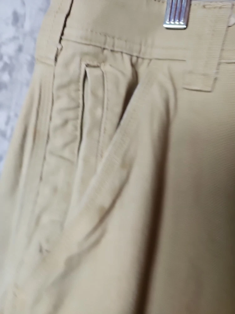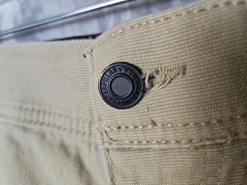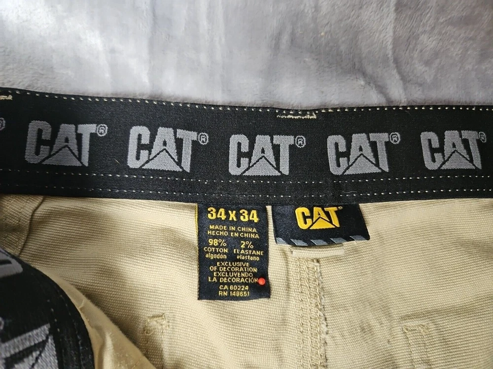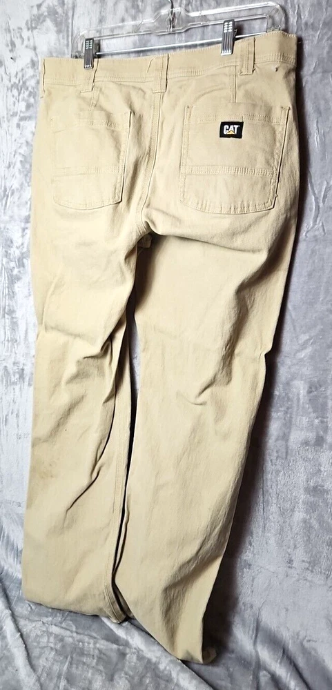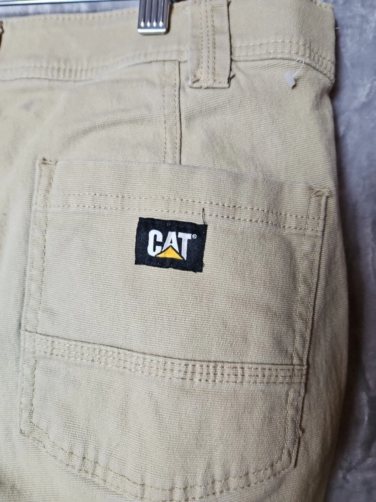 These CAT Caterpillar Utility Pants are designed for men in a size 34 with a regular fit. Made from a cotton blend fabric, these beige pants feature a utility style with cargo pockets, button and zipper accents, and a straight leg design. Suitable for workwear, they offer comfort and breathability, making them ideal for outdoor activities in winter, fall, and spring. The pants are easy to care for and have a flat front, suitable for a classic and modern outdoor look.