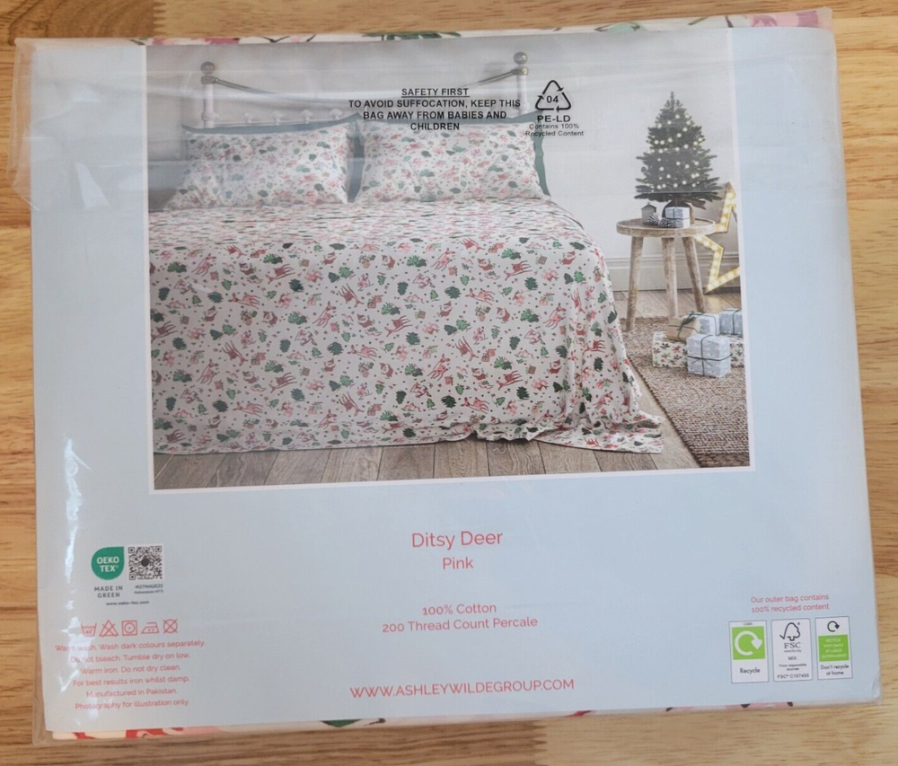 Size:DoubleTheme:Holiday, Luxury, Christmasgtin13:Does Not ApplyType:Sheet SetLabels & Certifications:STANDARD 100 by OEKO-TEXModel:Ditsy Deer PinkPattern:Ditsy DeerRoom:BedroomColor:MulticolorCountry of Origin:PakistanUPC:Does Not ApplyCharacter Family:Designed in the UKCharacter:FarmhouseThread Count:200TCMaterial:100% Cotton, PercaleShape:RectangularBrand:Cath KidstonCare Instructions:Machine WashStyle:CottageFeatures:Breathable, Deep Fitted, Machine Washable, 100% Cotton Percale, Country