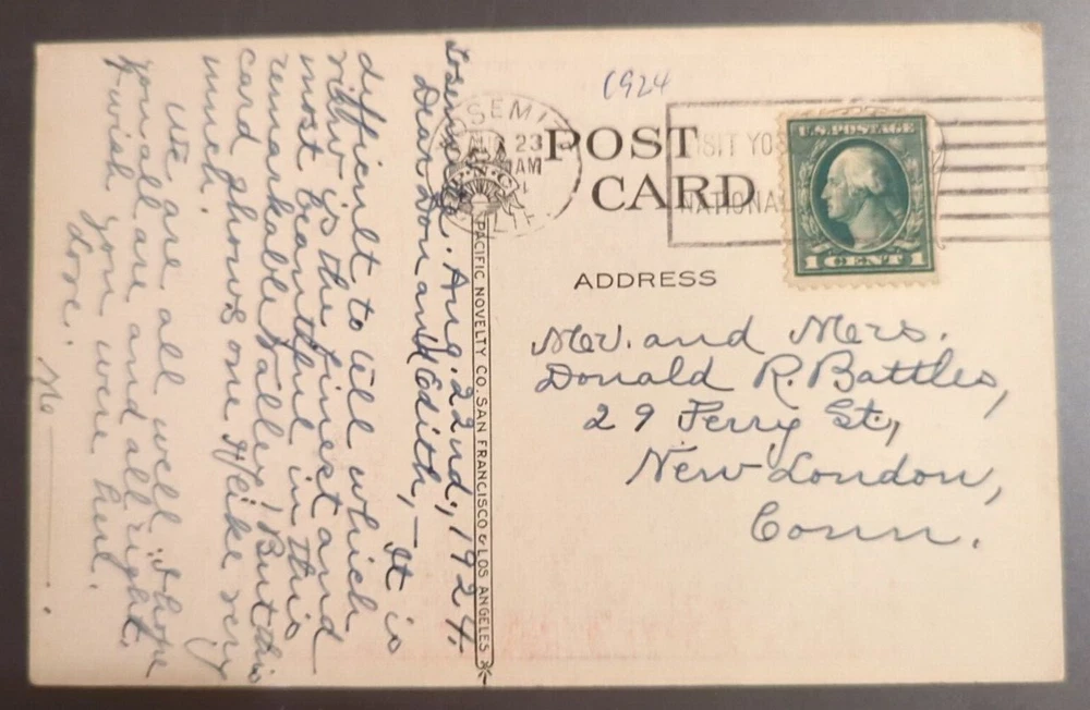 Antique Souvenir Postcard Cathedral Spires Yosemite Valley California 1924. There may be wear on the edges or a bent or torn corner, staining or writing on the card, creasing, or the card may have a cancellation mark. Most of the postcards I sell are 50 to 100+ years old and will never be perfect. Please examine the photos carefully for condition information. All postcards with a value of less than $20 are shipped via eBay Standard Envelope with a 2 mm postcard sleeve and a piece of cardstock on either side, taped closed with masking tape and placed in a heavy cardboard mailer. Postcards with a value of more than $20 are sent Ground Advantage in a 2 mm postcard sleeve, sandwiched between cardboard and shipped in a padded polybag. Both methods are provided with tracking.