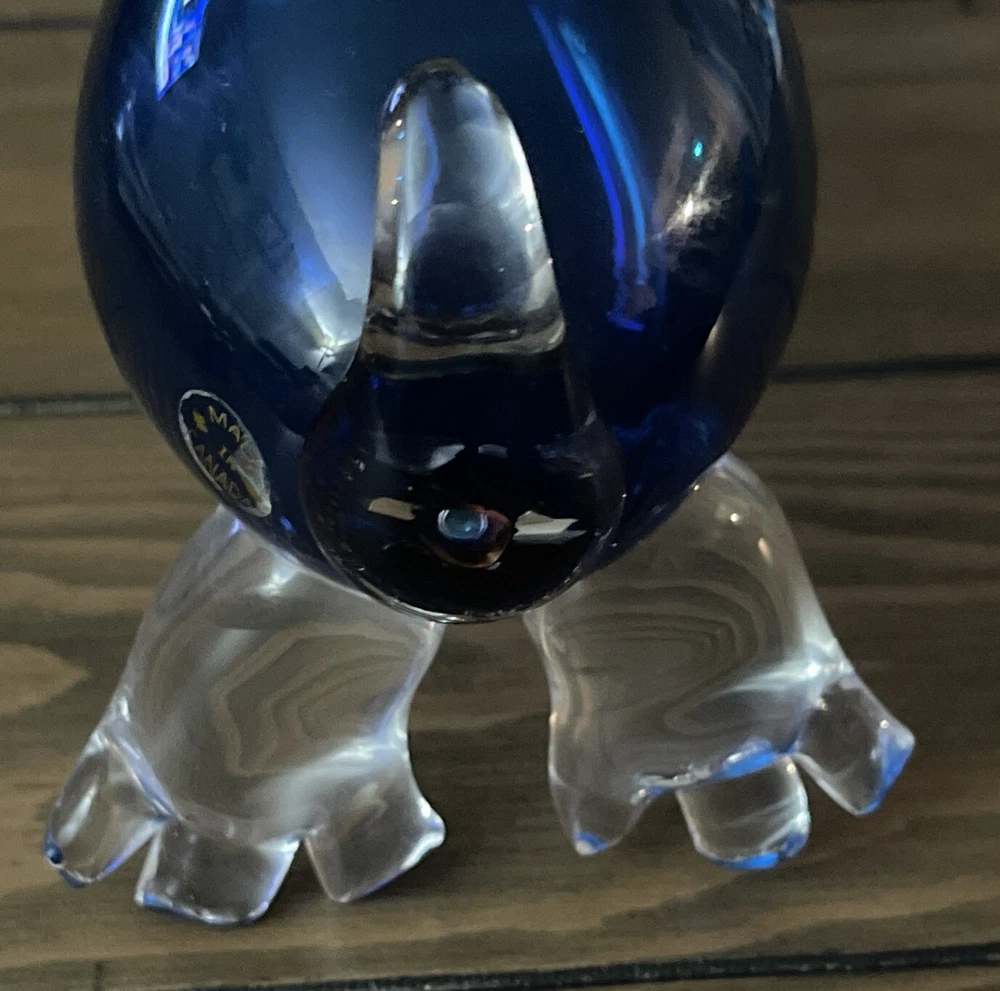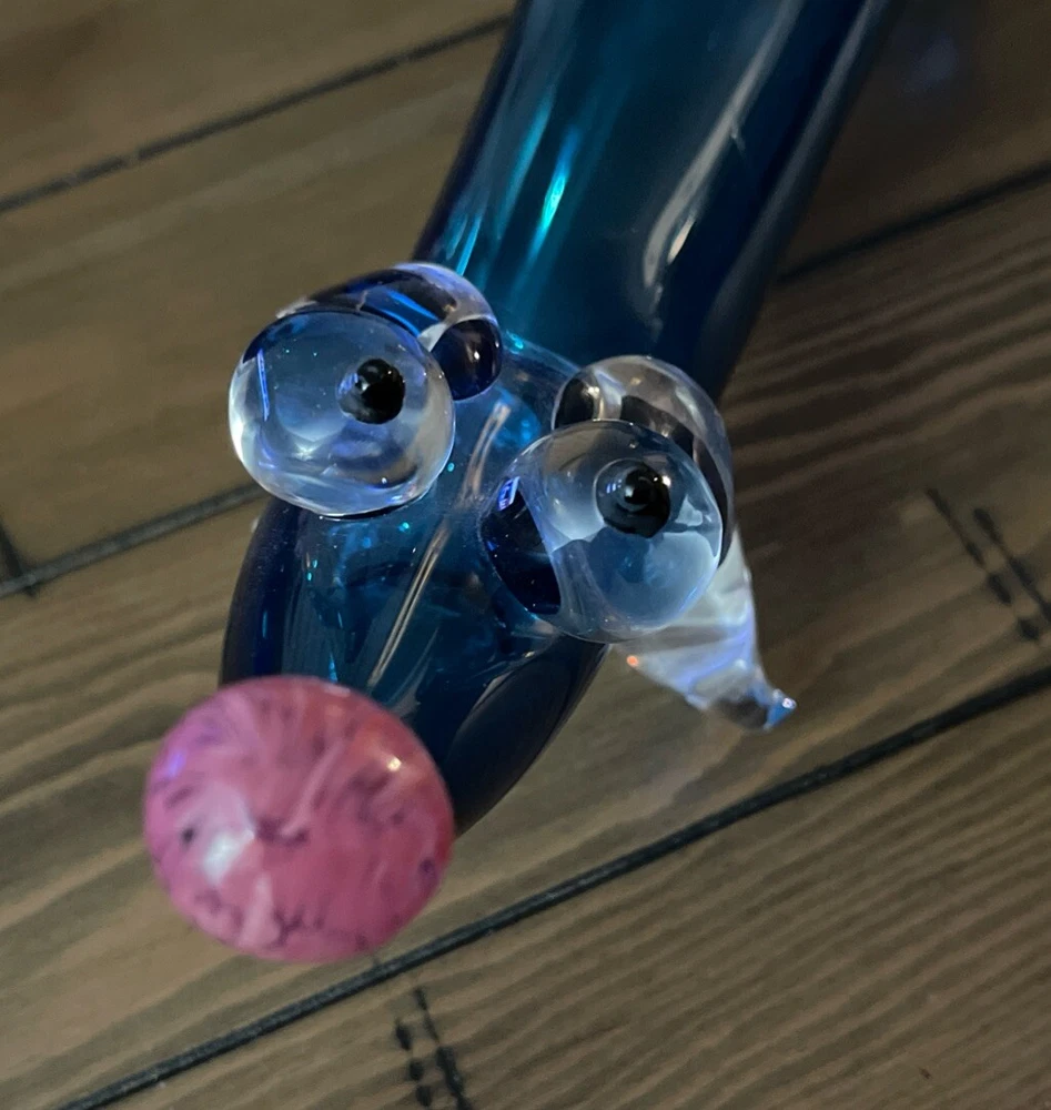 This Catherine Labonte glass sculpture features a contemporary design of a Weiner Dog in transparent blue glass. Measuring 13 inches in length, 6 inches in height, and 3 inches in width, this hand-blown piece showcases a pink swirled nose, adding a whimsical and colorful touch to the figurine. Signed by Catherine Labonte, this original art glass sculpture is a unique and playful addition to any collection, highlighting the artist's expertise in creating novelty pieces with a studio aesthetic. Gorgeous and fun - no chips or cracks - no scratches that I can see or feel - sooo cute for dog or Weiner dog lovers!
