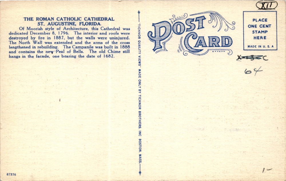 MAKE AN OFFER. THE MORE YOU BUY THE BETTER DEAL I WILL ACCEPT The postcard features the Catholic Cathedral and Plaza in St. Augustine, Florida, which is known as the oldest city in the United States. The cathedral, built in Moorish style architecture, was dedicated on December 8, 1796. It suffered a fire in 1887 that destroyed the interior and roofs, but the walls remained intact.