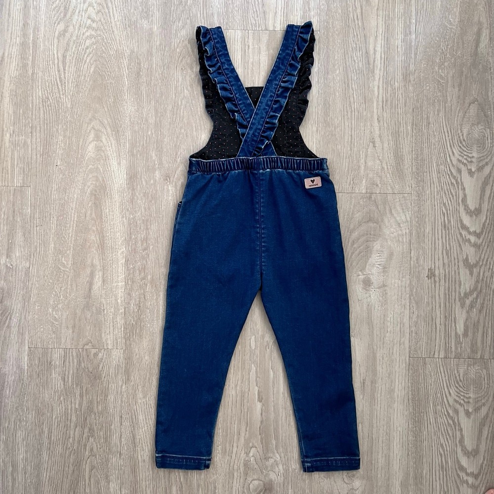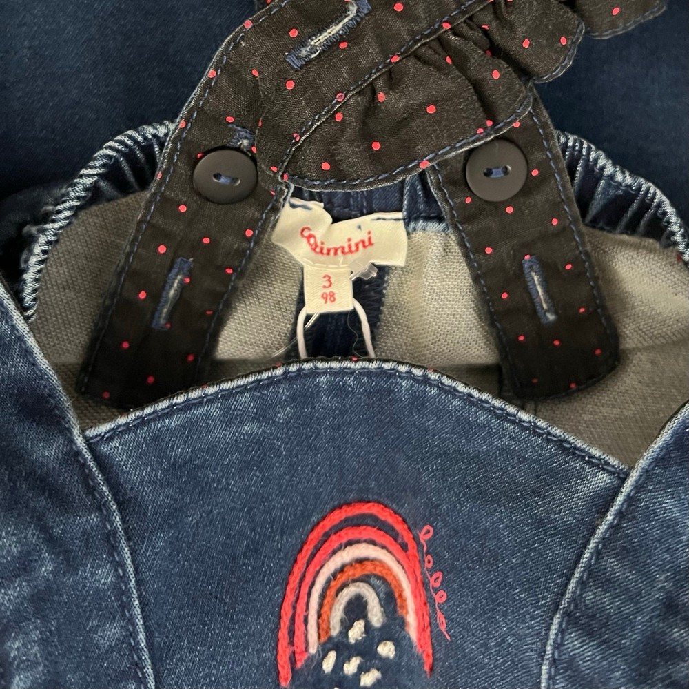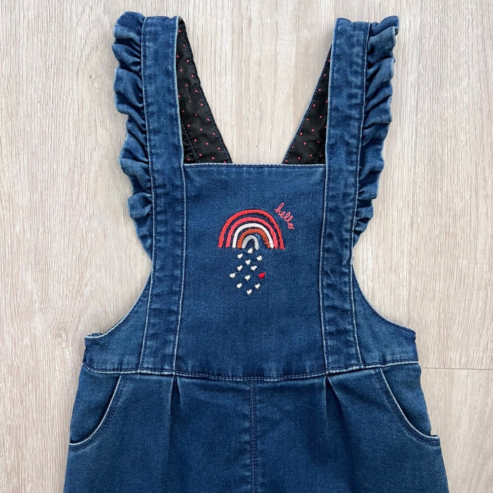 Catimini Blue Denim Overalls Size 3 with Ruffle Straps & Embroidered Rainbow