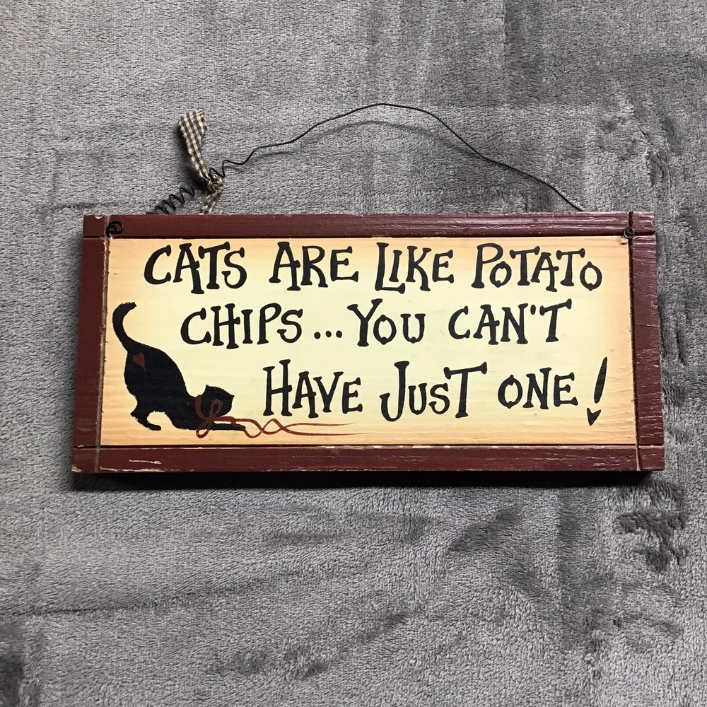 This wooden sign features a contemporary design with a wood grain pattern and a rectangular shape. It showcases the character of Ares and a theme centered around cats, making it a charming addition to any room in your home. The sign includes a wire hanger for easy display and depicts the phrase "Cats Are Like Potato Chips...You Can't Just Have One", adding a touch of humor and whimsy to your decor. Perfect for cat lovers who appreciate a touch of personality in their home.