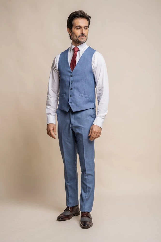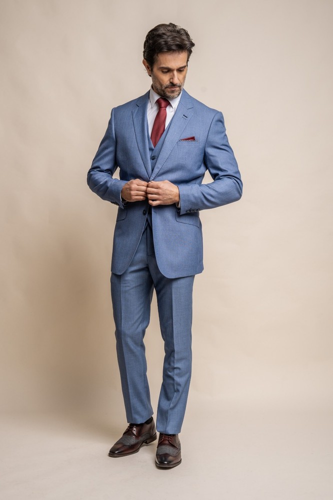 Add to Watch List Ask a Question Tailored Elegance: Embrace sophistication with Cavani's Slim Fit Sky Blue Suit; available as separate pieces to customize your style. Versatile Pieces: Select the slim jacket, single-breasted waistcoat, or trousers to create your personalized formal look. Wedding and Business Ready: Ideal for any formal occasion - be it a wedding, a business event, or a gala. Contemporary Fit: Each piece is designed to fit close to the body for a modern, streamlined silhouette. High-Quality Materials: Constructed with 80% Polyester and 20% Rayon for durability and comfort. The 100% Polyester lining ensures a luxurious feel. Jacket Features: Notch lapel, two-button fastening, three-button cuff detail, and dual interior pockets for functionality. Waistcoat Highlights: Classic single-breasted design with jetted pockets and button front, fully lined for comfort. Trousers Design: Slim fit with a button and zipper closure, single front pleat, and a straight bottom for a sharp look. Perfect Pairings: Match with our selection of dress shoes to complete your outfit. Fit & Sizing: Reference our size chart to ensure the perfect fit before ordering. Care Instructions: Preserve the pristine condition of your suit with our dry clean only care approach. Images are of the actual item under neutral lighting condition and may seem slightly different on different screens. Tie print may vary Fast Delivery Lowest Prices Secure Checkout Join our mailing list Size Chart Product Description Men's Sky Blue Slim Fit Suit - Jacket, Waistcoat, Trousers - Wedding Business 3 Piece Set - Mix & Match Look sharp and stylish is a piece of cake with this sky blue set for men designed by Cavani. This set is perfect for any wedding, formal occasion, or business engagement, and it is available separately, so you can choose the pieces that fit you best. The slim suit jacket, single-breasted waistcoat, and trousers all fit close to the body for a sleek appearance that will turn heads. Create the look that best suits your personality and the occasion by pairing the item of your choice with formal or semi-formal items. The eye-catching blue colour and luxurious feel to this men’s set will ensure that you will be the best dress gentleman in the room. Looking for some matching dress shoes? Check our collection of shoes for men Please check the size chart before placing your order. Composition Material: 80% Polyester, 20% Rayon Lining Material: 100% Polyester Care: Dry Clean Only Jacket Notch Lapel Two-button fastening Three-button cuff Two flip-up pockets Two interior pockets Three sleeve buttons Fully Lined Waistcoat Single-breasted Jetted pockets Button front fastening Fully Lined Trousers Slim fit Button closure with a zipper Fastening closing Single front pleat Straight bottom, No turn-up Single back pocket with button closure Size Chart Payment We accept the following secure payment methods using paypal. All payments are made in accordance with ebay s terms & conditions. Delivery & Returns If you are not satisfied with your purchase for any reason, please simply contact us and we will do our best to resolve the issue. To contact customer support via eBay DELIVERY Processing time: We process all orders within 24 hours. Orders placed before 2pm are dispatched on the same day. However, delivery times from UK to various international shipping addresses may vary. Delivery times: For UK deliveries: We ship all standard parcels by Royal Mail 48 Signed & Tracked service. Royal Mail aim to deliver the order within 2-3 working days. Services may take longer during bank holiday periods and sale periods. For Europe Deliveries: For Europe Deliveries: Your order will be shipped by Royal Mail International Signed for service Ireland, Germany, France, Netherlands, Belgium, Spain, Italy and Portugal: Estimated delivery 4 to 6 working days. Rest of Europe deliveries may take up to 10 working days For USA and Canada estimated delivery 6 to 10 working days. Rest of the World: deliveries may take up to 15 working days We also offer Express Service ( 1-3 days ) for some countries. Delivery times are an estimate and may be subject to delays outside of our control. If your parcel is stopped by customs this will show in the tracking information. If you are required to pay import taxes, duties or custom fees you will be contacted by your customs office for payment. Order Tracking: Standard Orders sent via standard economy service and may not have point to point tracking please allow the stated estimated delivery time before contacting us. Tracked Orders paid for as Express or tracked delivery will be provided tracking number and tracking link for the entire order journey. RETURNS We proudly offer 30 days money back guarantee on all purchases (from the date of purchase). For customers based outside of UK: If you would like a different size or colour , You will need to return the item back for a refund and place a new order. Please note that all items must be in its original sellable condition to be returned, Items that are worn or washed can not be exchanged. We do not mix and match articles from a suit. We sell suits as complete sets. Swapping articles from a suit renders the corresponding suit useless. Hence we are unable to process exchange / refund. RETURN ADDRESS: SIRRI RETURNS (BORDO LTD) REAR OF 63-65 WATERLOO ROAD WEST MIDLANDS B66 4JS UNITED KINGDOM Original postage charge is non-refundable. If your purchase is with free postage, You will be refunded in full. PLEASE NOTE: Please allow up to 48 hours for returns to be processed from the date of receipt. If you are after an exchange and short on time, Please place a new order and send the original order for a refund. When sending items back via any tracked service please let us have the copy of postage receipt so that we could track the progress of the returning item. We contact all customers once the returning item is received with us to get an update on their preference for r