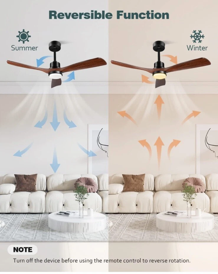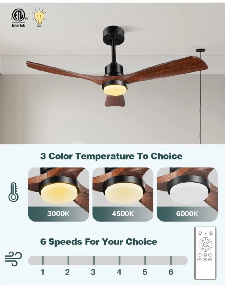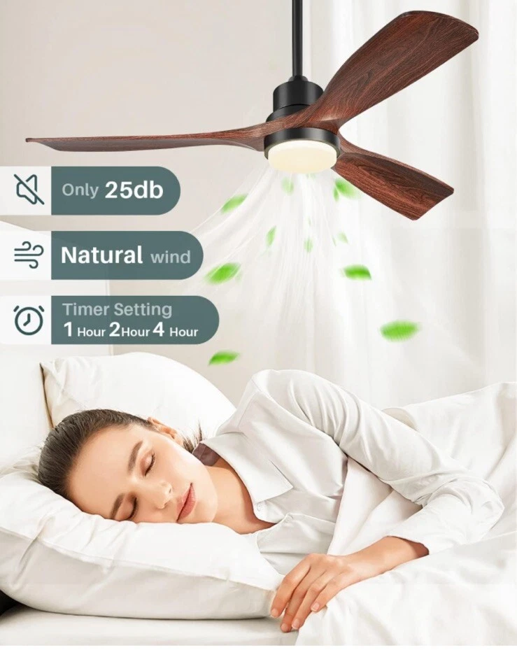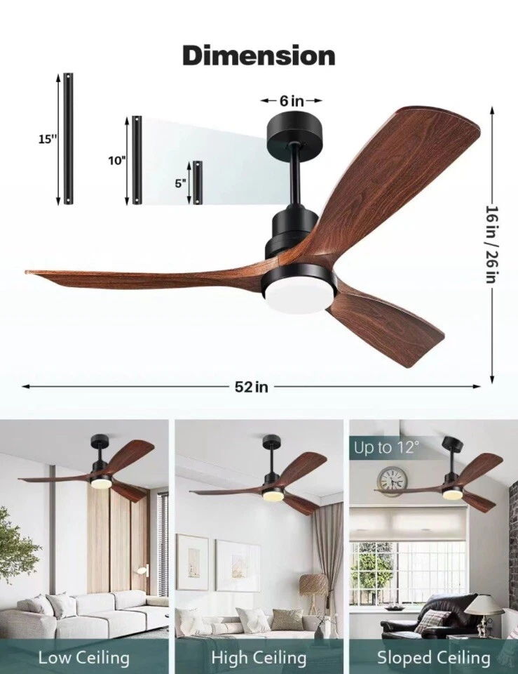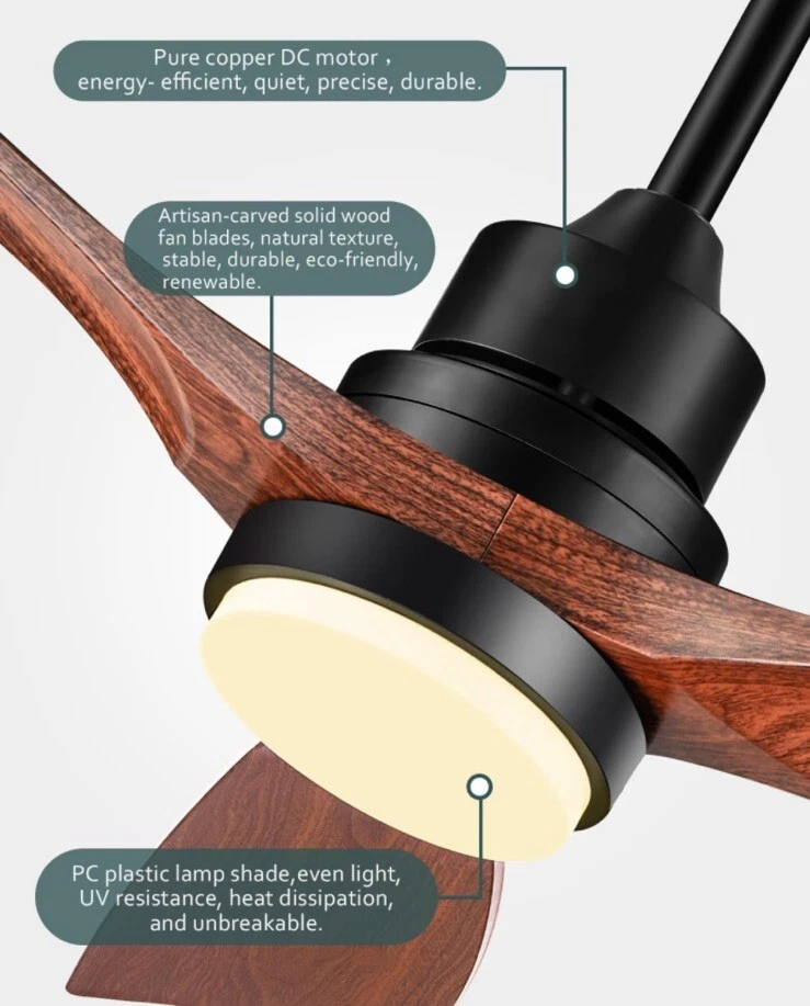 52'' Ceiling fan with lights, solid wooden blades, flush mount for low ceilings