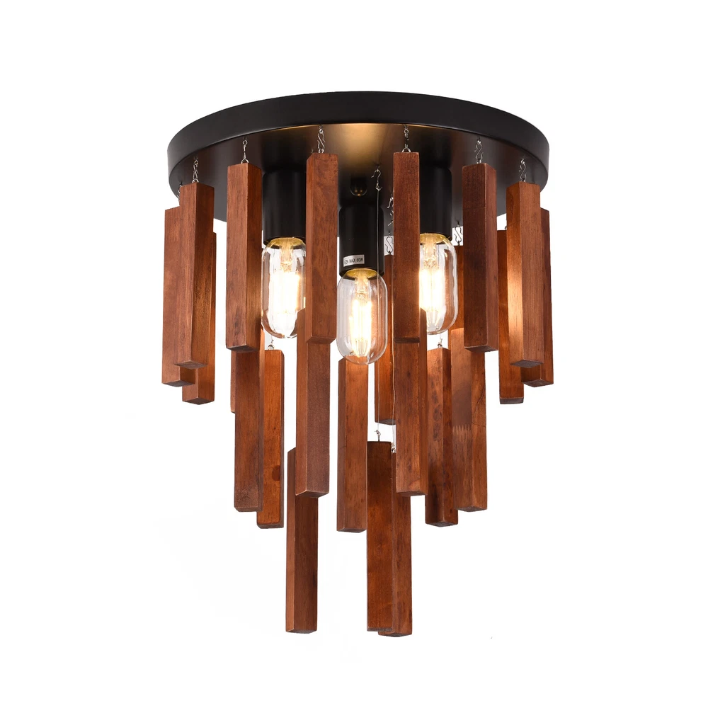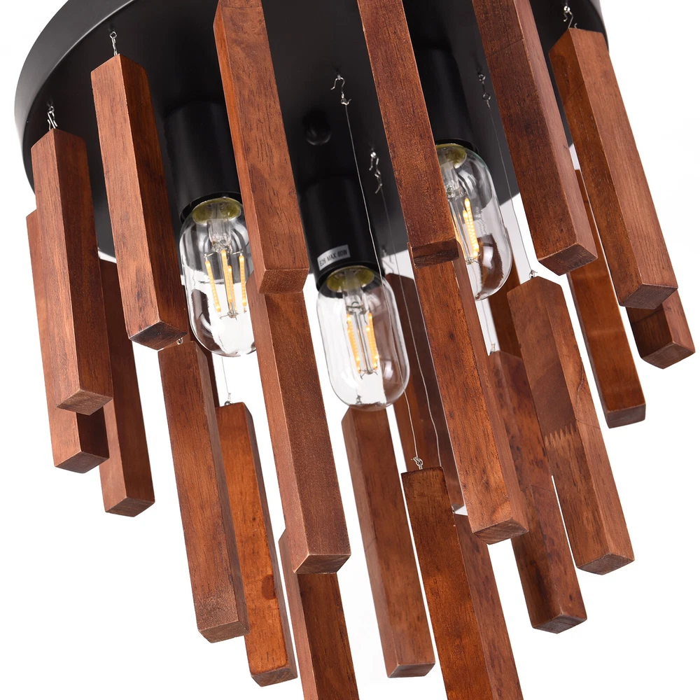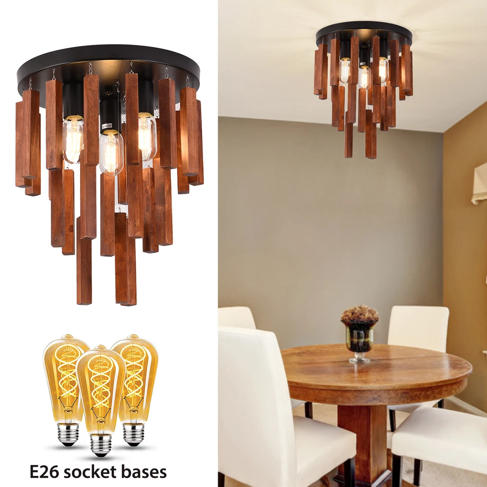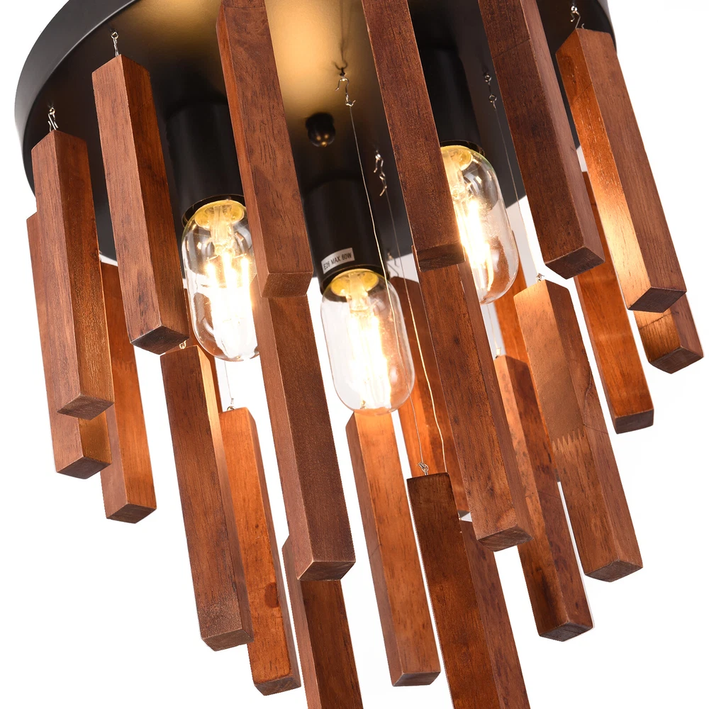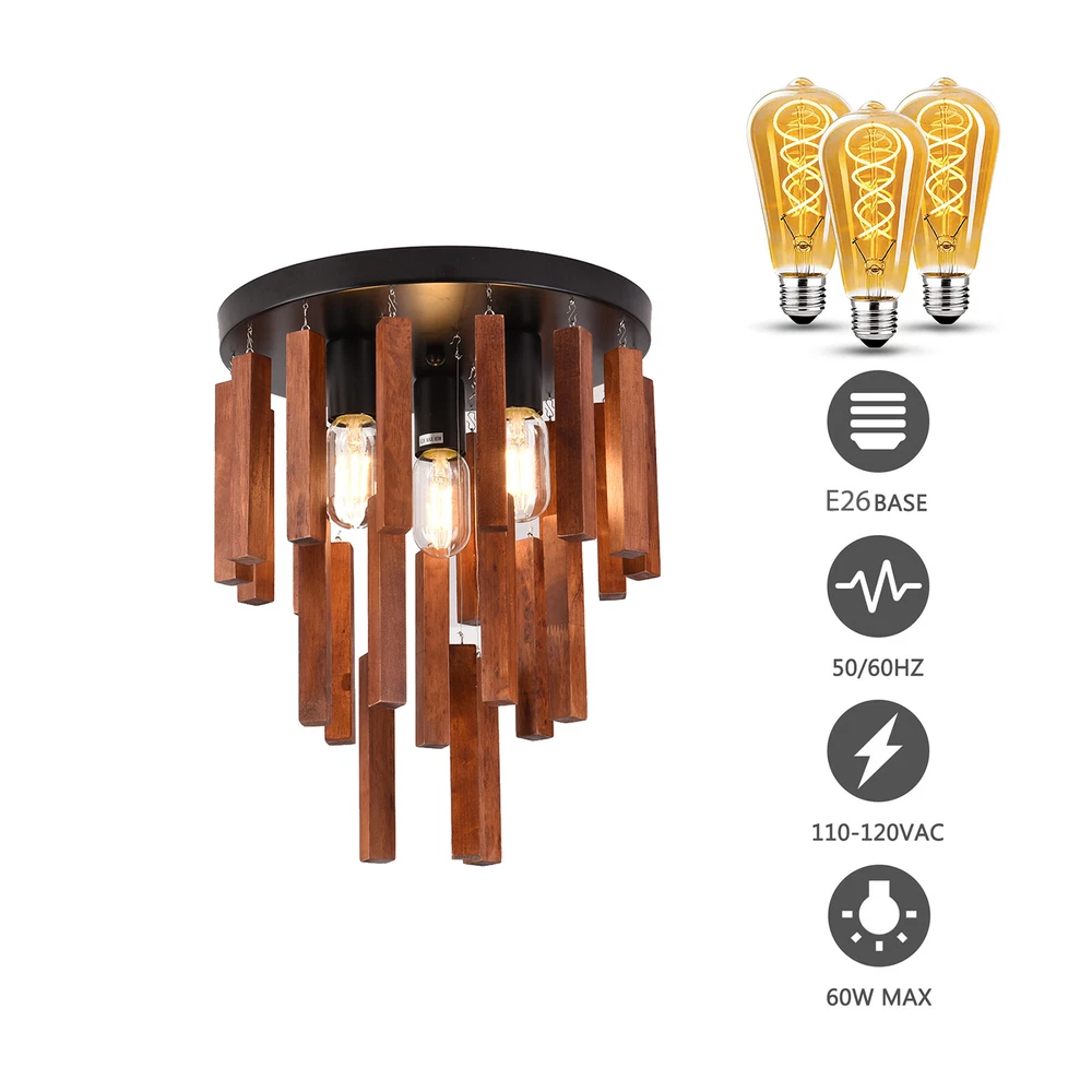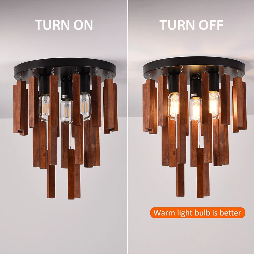 Ceiling Light Fixture Rustic Wooden Chandelier Retro Ceiling Semi Flush Mount Description This ceiling light uses solid wood and iron material, making it anti-rust , high-strength, and long-lasting. With wood forming the lampshade in a beautiful meteor form, it will cast a warm shimmering reflection on the ceiling when on, adding romance to your home. Key Features High-quality Material: This ceiling light adopts an iron chassis and solid wood lampshade, making it anti-rust , corrosion-resistant , and high-strength. Beautiful Lighting Effect: Applying evenly distributed rectangular wood, this ceiling light casts gorgeous rays on the ceiling to make a beautiful lighting effect and create a warm&romantic atmosphere in your living room. Retro Appearance: With a unique meteor form design and a classic round chassis, this ceiling light looks retro industrial, adding beauty and vintage elements to your room. Wide Compatibility: Three standard E26 bases make you choose different style bulbs such as LED, incandescent, and halogen to create different lighting effects. Dimmable: It is fully dimmable when used with dimmable bulbs and compatible dimming switches. Easy to Install : You can assemble the wood lampshade easily with the hooks. Then you just need to connect the wire reserved on the ceiling. And there is an English manual for your reference. Easy to Clean: Due to the painting surface treatment, you can easily wipe the dirt from it with a wet cloth. Ideal Gift: Thanks to its exquisite design, elegant appearance, and beautiful lighting effect, you can choose this ceiling light as a gift for housewarming to your friends. Protective Package: To prevent the product from being damaged and bumped during transportation, we packed it with pearl cotton to protect your products to the maximum extent possible. Details Hooks&Piercings: The piercings on the chassis&wood lampshade and hooks allow for convenient assembly. Open Bottom: With the open design, you just screw the E26 bulbs you want into the lamp holder. Stable Chassis: The round iron chassis with a nut in the middle ensures stable support for the light body and present classic beauty. Stainless Steel Wire: The solid wood is hung by stainless steel wires, making it sturdy. Application It is ideal for kitchens, hallways, living rooms, bedrooms, balconies, bars, aisles, foyers, hotels, restaurants, corridors, cafes, dining rooms, children's rooms, libraries, and other indoors. And its applicable area is 53-107.6ft². Specifications Model: 8923 Color: Black Material: Solid Wood, Metal Processes: Painting, Grinding Style: Retro Shape: Round Mounting Type: Ceiling Mount Indoor/Outdoor Usage: Indoor Specific Uses: Home Special Feature: Dimmable (Depending on the Bulbs you Choose) Light Fixture Form: Close to Ceiling Light Direction: Downlight Light Source: 3* E26 Bulbs (Not Included) Bulbs Type: LED, Incandescent, Halogen, Etc. Voltage: 110V Max. Single Bulb Power: 60W Applicable Area: 5-10m²/53-107.6ft² Chassis Thickness: 2.5cm/0.98inch Ceiling Light Height: 34cm/13.38inch Ceiling Light Diameter: 32cm/12.59inch Package Included 1* Ceiling Light 1* English Manual Notes Please check the product size before ordering to make sure it fits your room. You need 3 E26 bulbs with a single bulb less than 60W (not included). Please make sure the power is cut off before installation. To ensure your safety, we recommend that two people install this ceiling light together. Please install it by someone with an electrical license if necessary. Please use it in a dry environment. It is not suitable for outdoors and bathrooms because the wood will get wet. Please read the English manual carefully before installation. Please allow the slight color difference caused by the shooting light and 1-3cm error due to manual measurement, and make sure you do not mind before you order. Payment Delivery details Terms of sales About us Contact us Payment We accept ebay payment 。 Fees such as import duties, taxes are not included in the item price or shipping costs. These charges are the buyer's responsibility. Delivery details Shipping: 2-9 working days to: USA Terms of sales We maintain high standards of excellence and strive for hundred percent customer satisfaction. Feedback is very important to us. We hope that you contact us immediately before you give neutral or negative feedback, so that we can address your concerns. It is impossible to address issues if we do not know about them! About us Your satis faction is our ultimate goal. We work hard to earn your trust and future business. Our certified technicians have tested each item before shipping. The unit comes with 1 year limited warranty on all manufacturing defects. a) If you receive a defective item, you may return it or ask for a discount. Please contact us within 14 days after you receive the package. b) What you returned must be intact and in its original packaging as re? u. Customer is responsible for shipping costs of the returned item. c) We will cover the cost of shipping back t with the shipping rate indicated in the registration page. We will send you a new unit or refund the full payment you paid. Thank you. Contact us Business Hour Business Hour: Monday To Friday: 8:30 AM to 5:00 PM (Beijing China time) Due to time zones, our reply to your questions may not be immediately. But within above working time, we will reply your email within 24 hours. If it's non-workdays, please kindly be patient and wait till Monday. Please contact us with ebay message. Please feel free to contact us if you have any questions. Monday To Friday: 8:30 AM to 5:00 PM (Beijing China time) Due to time zones, our reply to your questions may not be immediately. But within above working time, we will reply your email within 24 hours. If it's non-workdays, please kindly be patient and wait till Monday. Please contact us with ebay message. Please feel free to contact us if you have any questions.