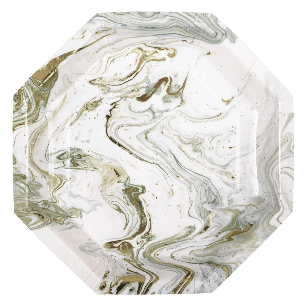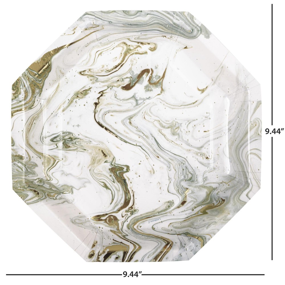 Set the scene for a glamorous celebration with our Gold and Silver Marble Party Tableware and Decoration Kit. Featuring pops of gold and silver with a chic marble print, this ensemble is stylish for a bridal shower, birthday party, or New Year’s Eve party! In this kit, you’ll find enough disposable tableware to celebrate with up to 16 guests, including 16 dinner plates, 20 cake plates, and 32 lunch napkins. Put the perfect finishing touches on your space with our 9-foot glitter flag banner and 3 ounces of foil confetti! Add more glitzy style to your bash and shop the rest of our affordable silver and gold party supplies. 20 Cake Plates (7”) 16 Paper Plates (9”) 32 Luncheon Napkins (6.5”) 1 Party Banner (9ft) 1 Pack of Jumbo Foil Confetti (3oz) Makes decorating your birthday party easy Combine with more Gold and Silver Marble party supplies