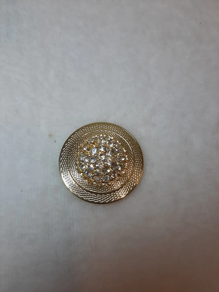 Celebrity V Gold Tone Pin Brooch Round Texture Raised Faux Stones Signed Vintage In good pre-owned condition may show signs of wear from use/handling/storage/display. Please view all pics for condition/details/flaws/issues. SOLD AS IS There is/maybe marks/spots/dirt/debris please see photos 1-5, there is/maybe paint loss/sticker loss please see photos 1-5, there is lite discoloration please see photos 1-5, there are surface scratches to item please see photos 1-5, please see all photos for condition/issues/details.