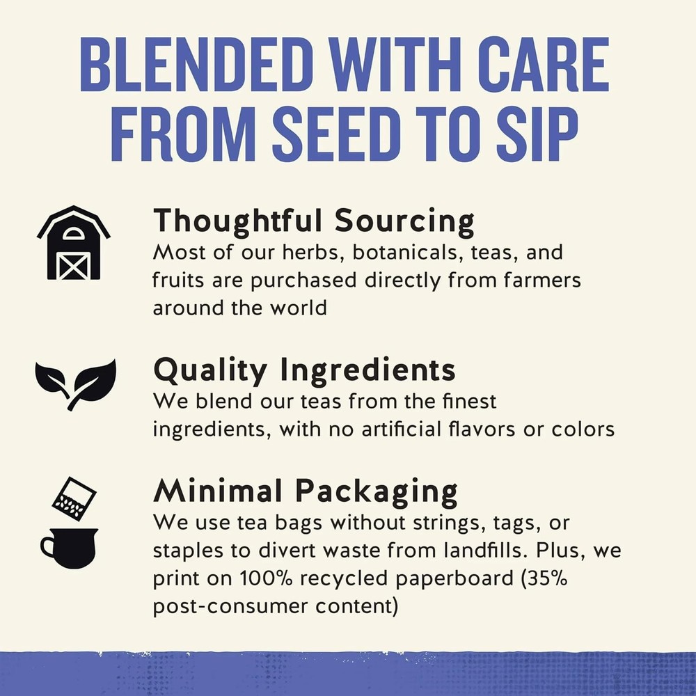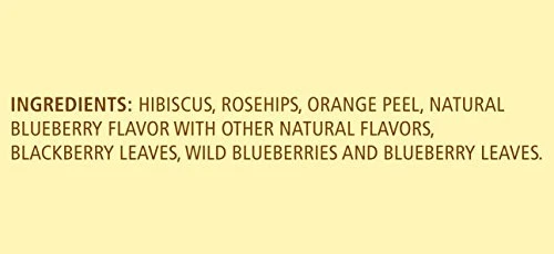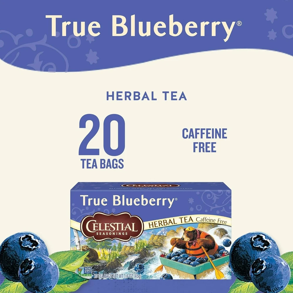 Celestial Seasonings Caffeine Free, Herbal Tea Bag, True Blueberry, 20 Count (Pack Of 3) Celestial Seasonings True Blueberry Herbal Tea is the perfect caffeine free addition to your daily routine. This tea has an intense wild blueberry flavor with subtle overtones of purple grapes; a sweet and deep berry flavor that is just as delicious hot as cold. Put some magic in your mug and enjoy the goodness found in every cup of Celestial Seasonings Teas. Celestial Seasonings teas are an invitation to put some magic in your mug! About this item Blended with wild blueberries and blackberry leaves for a bold, fruity taste Caffeine and gluten-free No artificial flavors, colors or artificial preservatives Steep tea bag in hot water for 4-6 minutes for the perfect cup Wild blueberry flavor with overtones of grapes Sweet & deep berry flavor No artificial colors or flavors Kosher and Gluten-Free Steep tea bag in hot water, enjoy hot or cold No strings, tags, or staples on tea bags Recycled paperboard (35% post-consumer content) Ingredients HIBISCUS, ROSEHIPS, ORANGE PEEL, NATURAL BLUEBERRY FLAVOR WITH OTHER NATURAL FLAVORS, BLACKBERRY LEAVES, WILD BLUEBERRIES AND BLUEBERRY LEAVES.