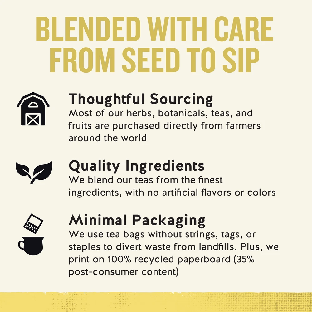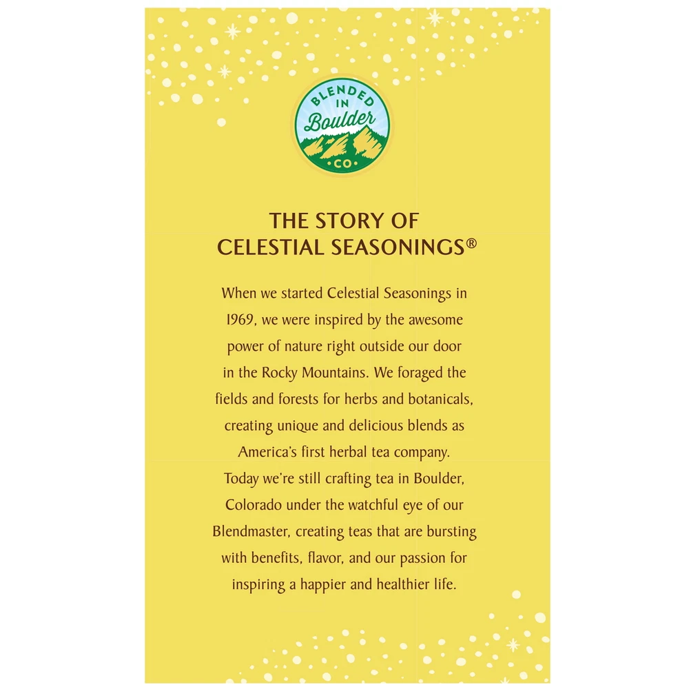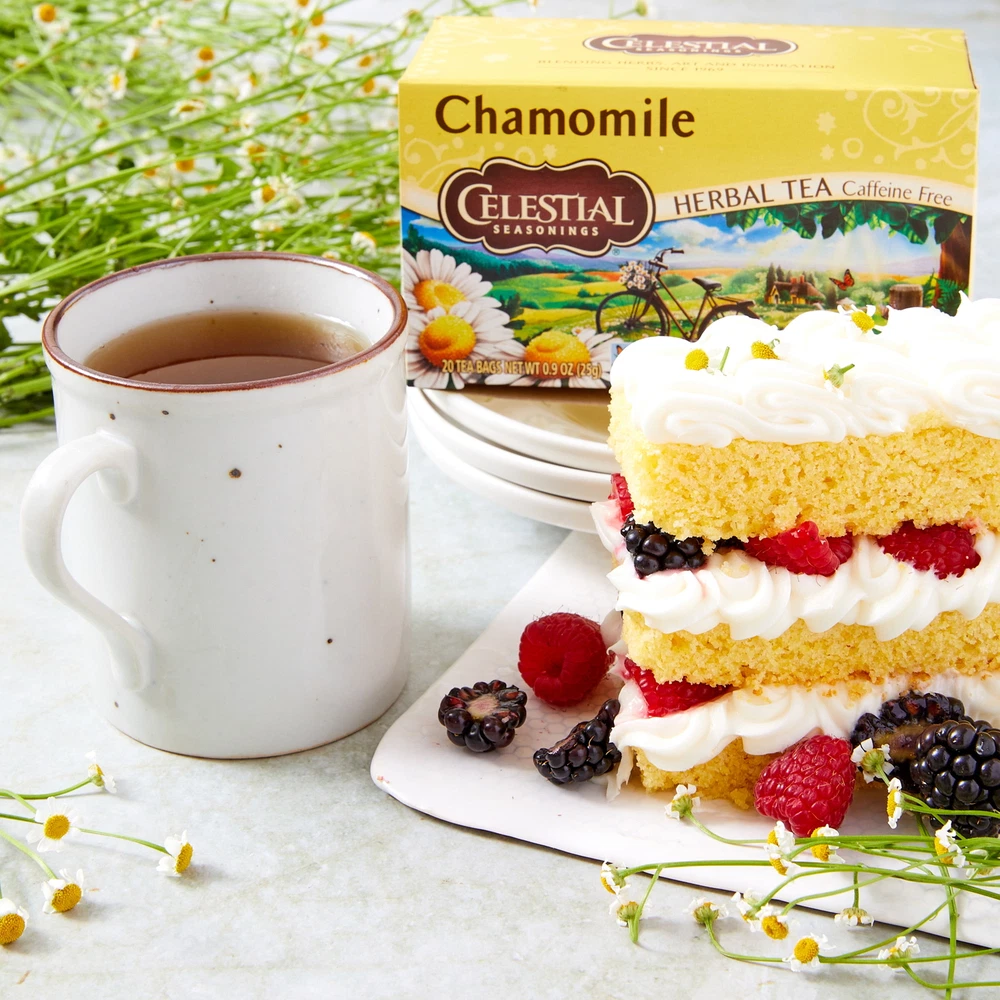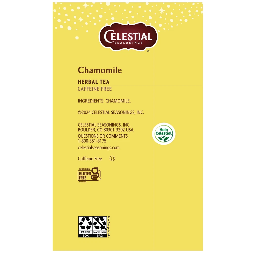 Nothing is more soothing than a cup of your favorite tea. Celestial Seasonings Chamomile Herbal Tea is the perfect caffeine free addition to your daily routine. Chamomile flowers from around the world are blended to create a soothing cup that supports relaxation, offering comfort anytime. Put some magic in your mug and enjoy the goodness found in every cup of Celestial Seasonings Teas! When we started Celestial Seasonings in 1969, we were inspired by the awesome power of right outside our door in the Rocky Mountains. We foraged the fields and forests for herbs and botanicals, creating unique and delicious blends as America’s first herbal tea company. Today we’re still crafting tea in Boulder, Colorado under the watchful eye of our Blendmaster, creating teas that are bursting with benefits, flavor, and our passion for inspiring a happier and healthier life. Celestial Seasonings Chamomile Caffeine-Free Herbal Tea Bags, 40 Count: Made with the highest quality Chamomile A calming & soothing blend Supports relaxation No artificial colors or flavors Kosher and gluten free Steep tea bag in hot water for 4-6 minutes No strings, tags, or staples on tea bags Recycled paperboard (35% post-consumer content)