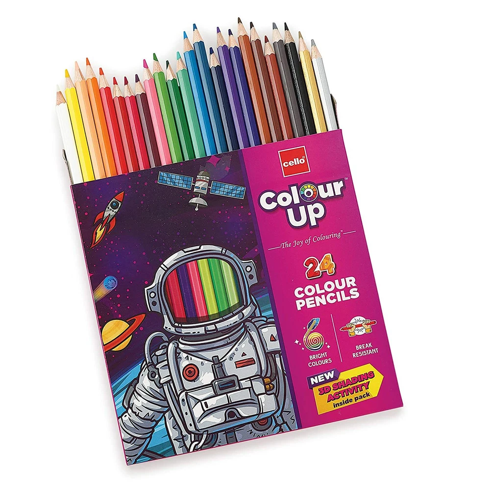 About this item Includes 24 different Bright Colours which fuel your child’s imagination and creativity Non-Toxic play safe materials used, compliant with European Toy standards (EN-71 certified) Break Resistant body, perfectly protecting the lead within for worry-free usage in writing, drawing and colouring Attractive adventure themed pack, ideal for gifting to all kids 3D Shading Art Activity included in the pack, Instructions at the back of pack Manufacturer Cello Brand Cello Model Number CEL1009320 Colour Multicolor Material Wood Number of Items 1 Size Pack of 24 Point Type Fine Manufacturer Part Number CEL1009320 Manufacturer Cello Country of Origin India Imported By BIC-Cello India (P) Ltd, C1/702, G1/701, G2702, 7th floor, Lotus Corporate Park, Western Express Highway, Goregaon (E), Mumbai- 400 063 Let your child explore the world of colours and open up his/her imagination with a pack of Cello ColourUP Colour Pencils! It’s 24 amazing shades will keep the little one occupied with a mindful activity like colouring for a long time. And to be extra safe around children, the entire ColourUp range is toxic-free! PACKING MAY CHANGE AS PER COMPANY POLICY. SHIPPING POLICY We ship through INDIA POST, FedEx, DHL worldwide we dispatch the goods within 2-3 working days after the confirmation of Payment received. The Goods are delivered within time frame mentioned from the date of dispatch. If for some reasons beyond our control, your area is not serviceable by our logistic partners, we will refund the money. IMPORTANT :- Kindly provide your Mobile No. whenever you make payment because its mandatory for standard shipping Services to ship article. RETURN POLICY We allow 100% Money back Guarantee to our customers within 30days of the receipt of the goods. If in any way you are not satisfied with our products you can send it back to us within 30days of the receipt of goods. The expenses related to sending it back to us like shipping charges, insurance charges, duty charges if any have to be paid by the buyer. Please Inform us before returning us the goods so that we can assist you in returning the goods. PAYMENT POLICY We Prefer Pay Pal(World Wide) only. Feedback · Please do not leave a negative feedback as a way to communicate. Any rating given to a seller can neither be changed nor modified. So better communicate for faster resolution to any disputes. · If you have any concerns regarding your purchase, please contact us via phone or mail, we assure you that a satisfactory resolution will be reached. If you like our product tell others. If not, tell us we will do our best to deliver as per commitment . For Any query , we request you to either use the ask question button. We normally reply back. Thanks for Visiting Us