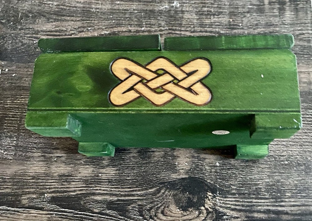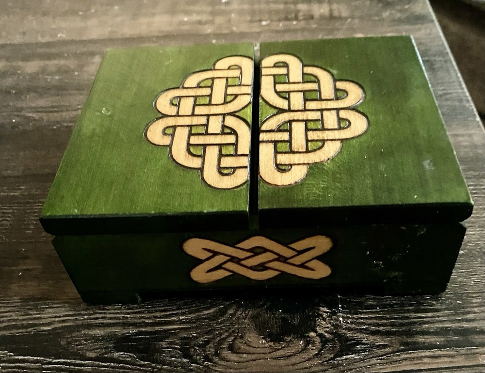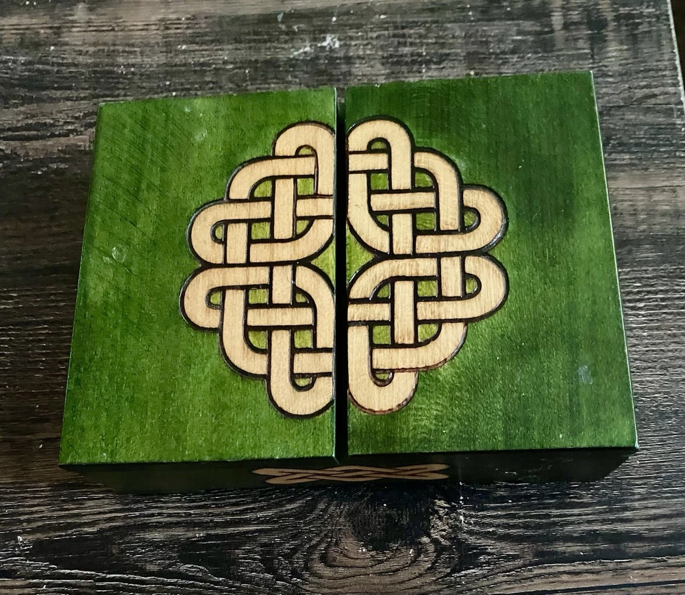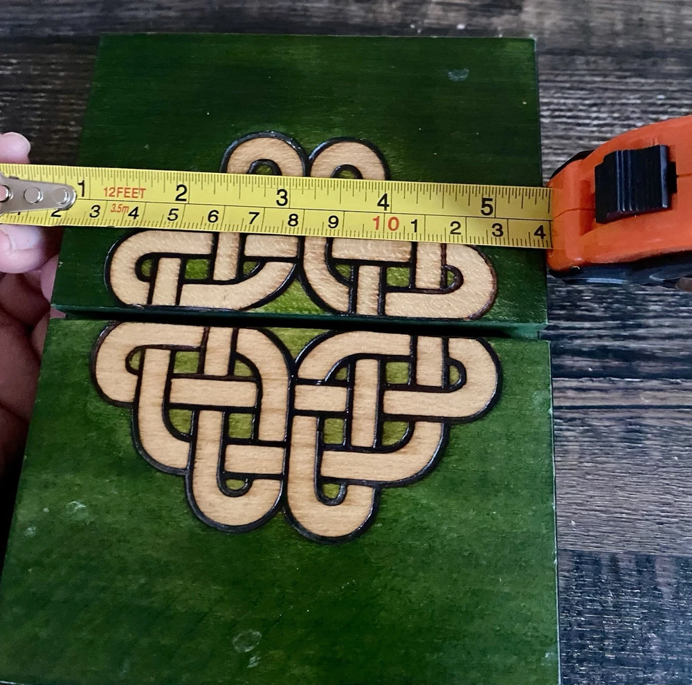 The Celtic Knot Keepsake Box is a handmade wooden square trinket box featuring a Celtic Knot pattern, perfect for storing small treasures or keepsakes. With a mystical Celtic theme, this original piece is ideal for all occasions and can be placed in any room of the home. The box is cleaned with a damp cloth and made in Poland, offering a unique and stylish addition to any space.