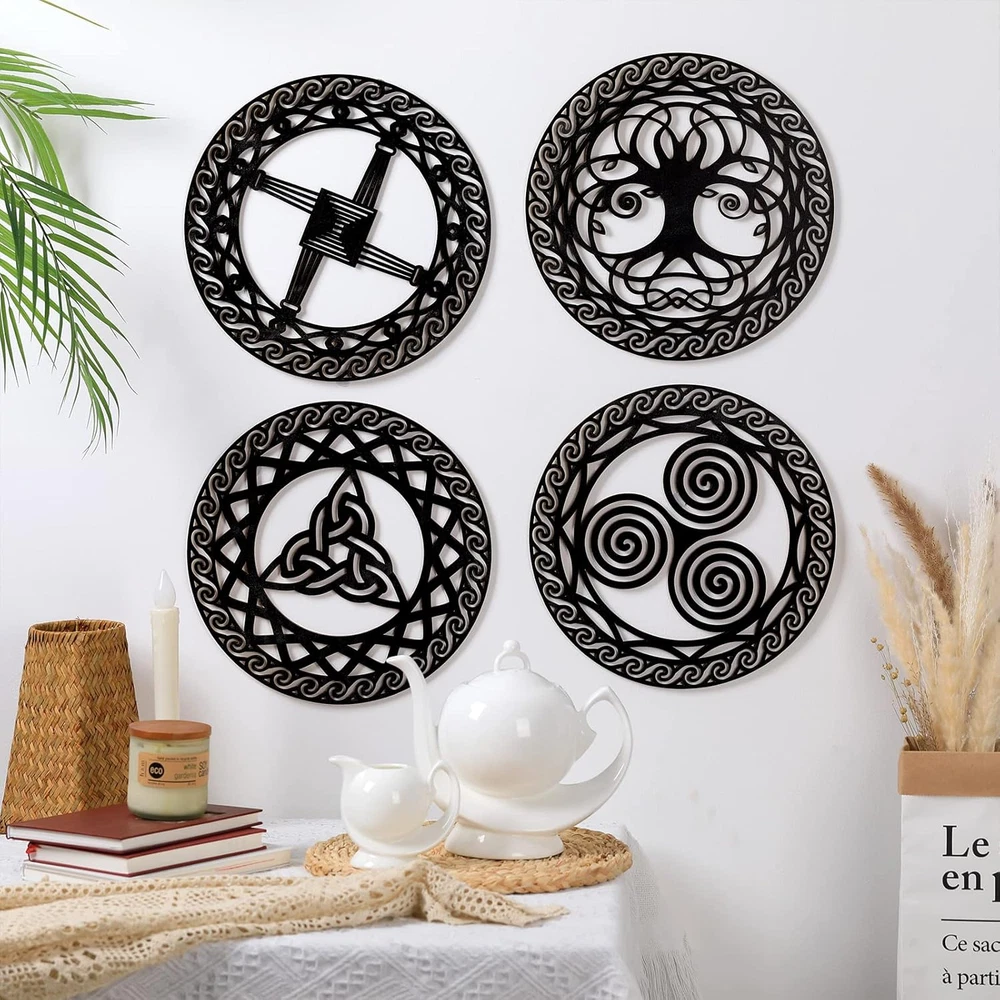 Proper Size: each sacred geometry wall art measures approx. 11.8 x 11.8 x 0.2 inches, proper in size and light in weight, will not take up too much space; The elegant wall decors can add warm atmosphere to your home Novel and Exquisite Design: these wood wall arts adopt Celtic symbols design, which is widely regarded as one of the oldest surviving Irish symbols, look novel and exquisite, these laser cut geometric patterns can better attract people's attention Reliable and Long Lasting: the wooden wall art decor is made of wood material with smooth surface and fine workmanship, tear and wear resistant, the classic color can also match well with any interior style Suitable for Many Occasions: you can use the Celtic wall arts to decorate your kitchen, living room, bedroom, bathroom, office, coffee shop and more, you can also hang them on the wall, door, window or fireplace; These wall art decors can add elegance to your room Meet Your Decorative Needs: this package comes with 4 pieces Celtic wall decors in 4 styles, the quantities and styles are sufficient that can better meet your home decorative needs; You can also share them with your close friends Features: Housewarming gifts: You can apply the wooden Celtic decors as housewarming gifts to send to your friends, neighbors, relatives or colleagues, people will feel happy after receiving them. Match well with other decors: Our Celtic decor wall art applies classic and delicate, can also match well with other decors in your home and leave a deeper impression on guests. Specifications: Material: wood Color: as shown Size: approx. 11.8 x 11.8 x 0.2 inch Package includes: 4 x Celtic wooden wall decors Notes: Manual measurement, please allow slight errors on size. The color may exist a slight difference due to different screen displays.
