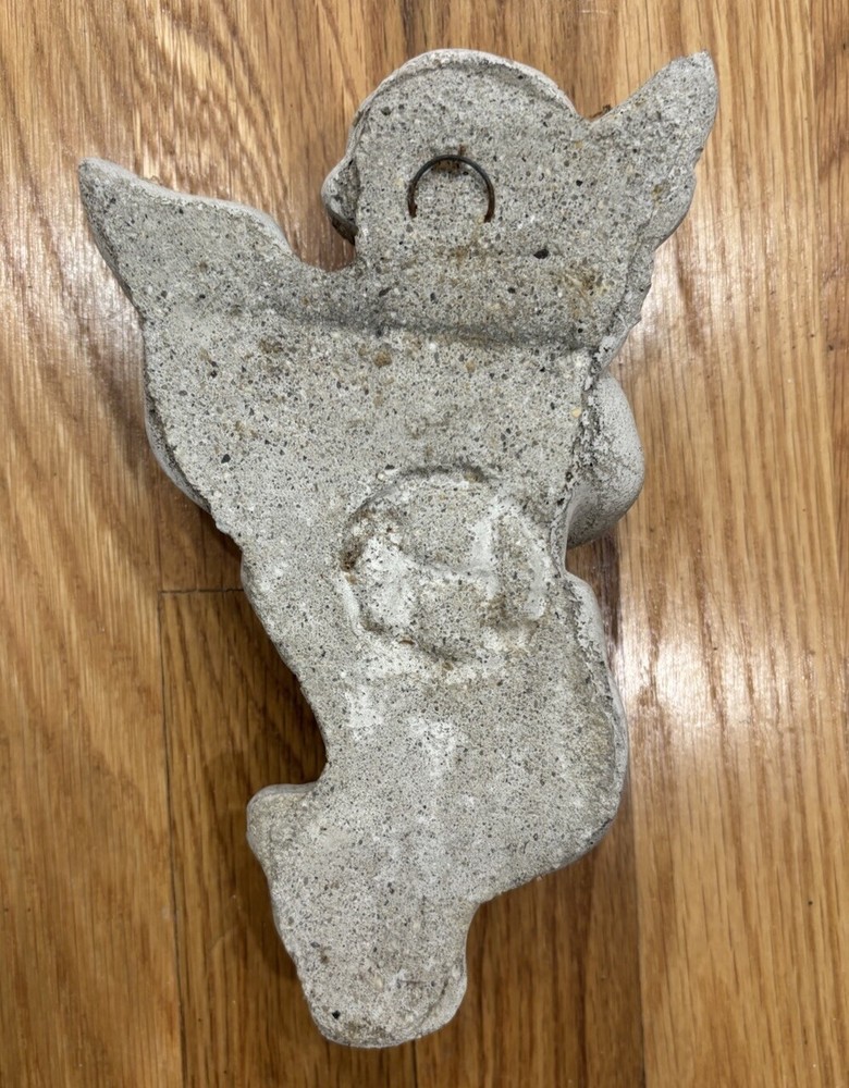 Vintage garden cement angel wall hanging. The angel measures approximately 8 1/2” by 5”. There is a hook for hanging. There are small areas that show wear like on the tips of the wings and small places on the body. Preowned. Good condition for age.
